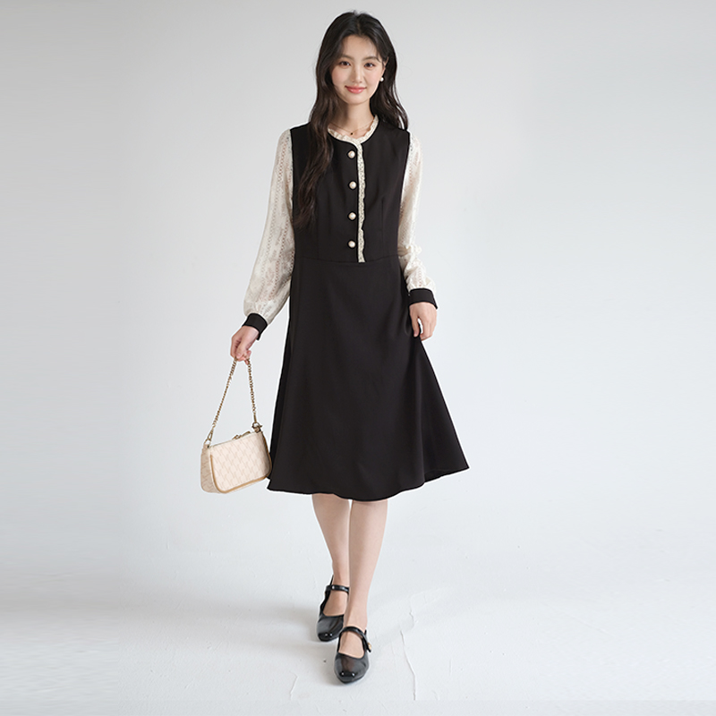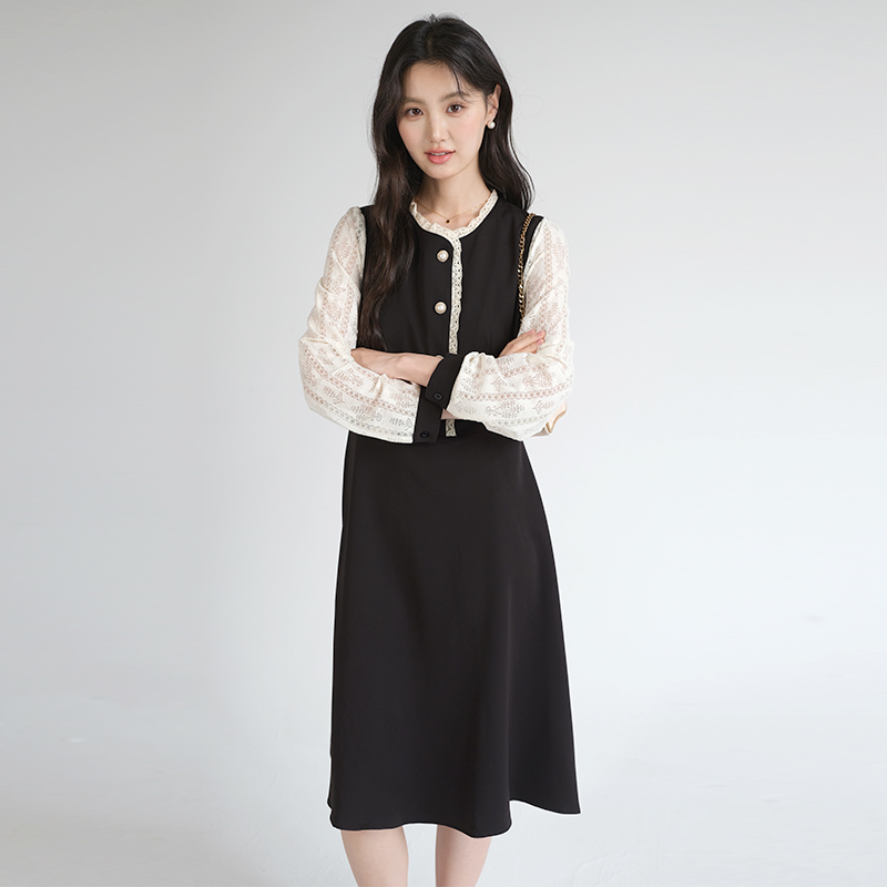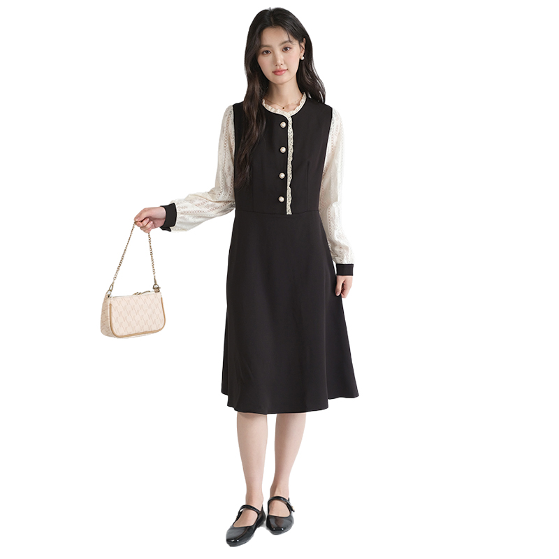 胖MM蕾丝长袖 蓝若水大码 新款 假两件拼接连衣裙2025秋装 a字裙 女装