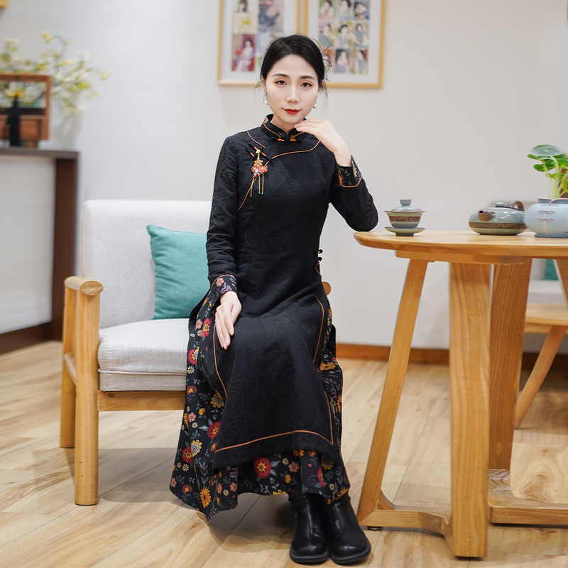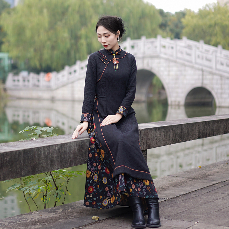 菲梦伊原创钉珠提花连衣裙女秋季 国风高端气质贵妇旗袍裙子 新中式