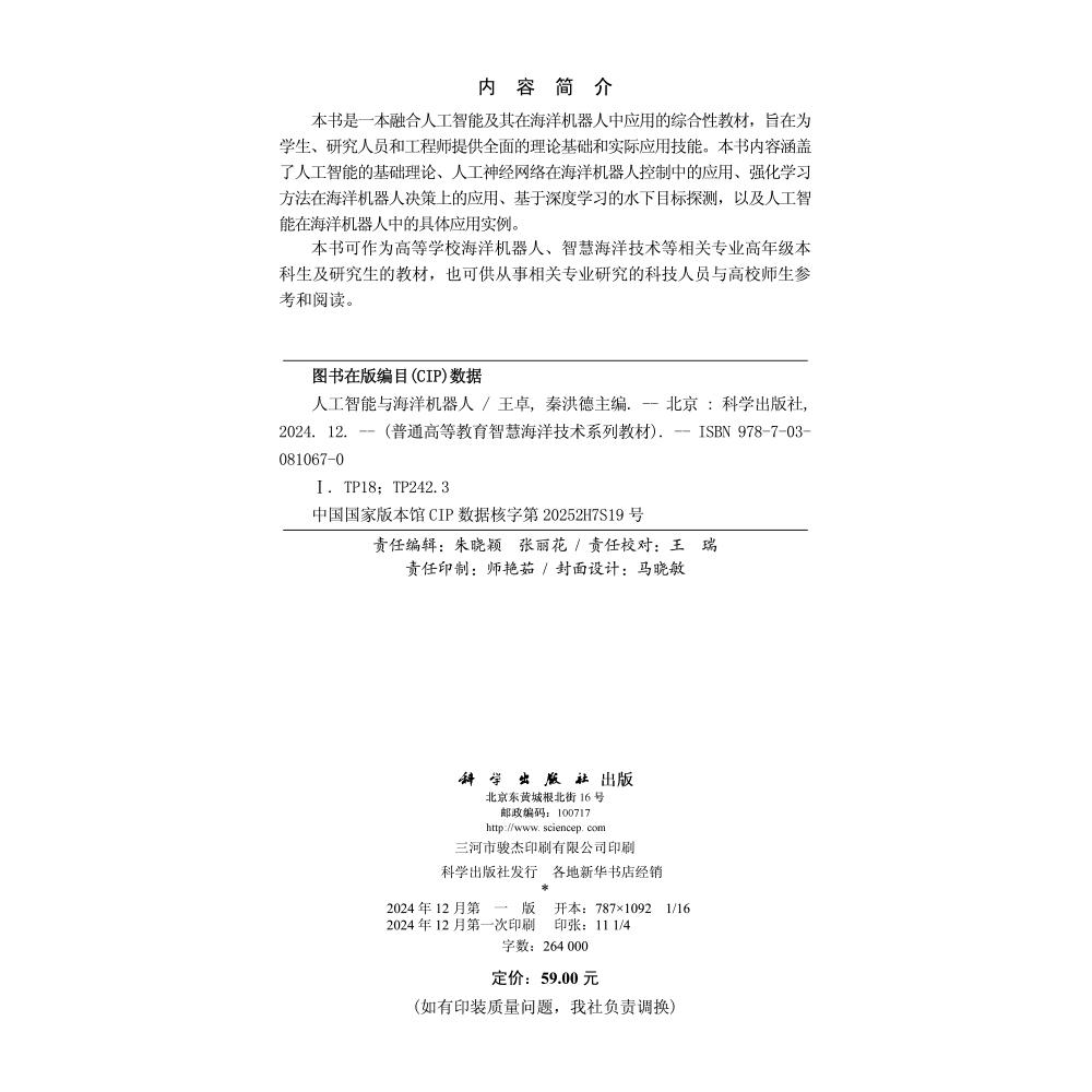 王卓 秦洪德 科学出版 现货正版 社 综合性教材 人工智能与海洋机器人 本书是一本融合人工智能及其在海洋机器人中应用 主编