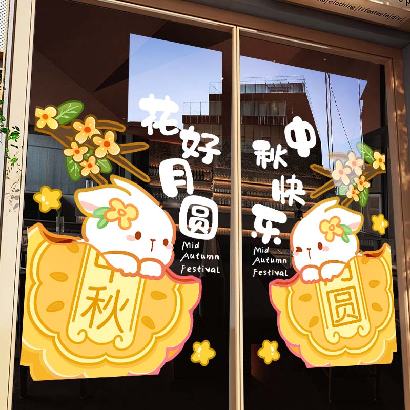 中秋国庆节装 饰卡通贴纸静电窗贴玻璃电梯门窗花橱窗大厅门贴布置