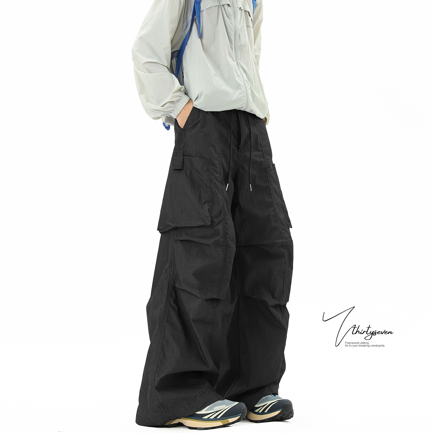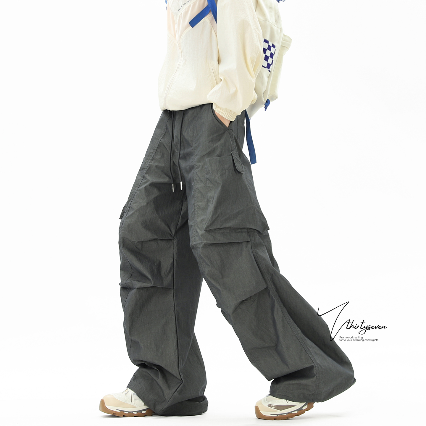 潮牌运动休闲裤 户外大口袋伞兵裤 子 男秋美式 设计感褶皱速干冲锋裤