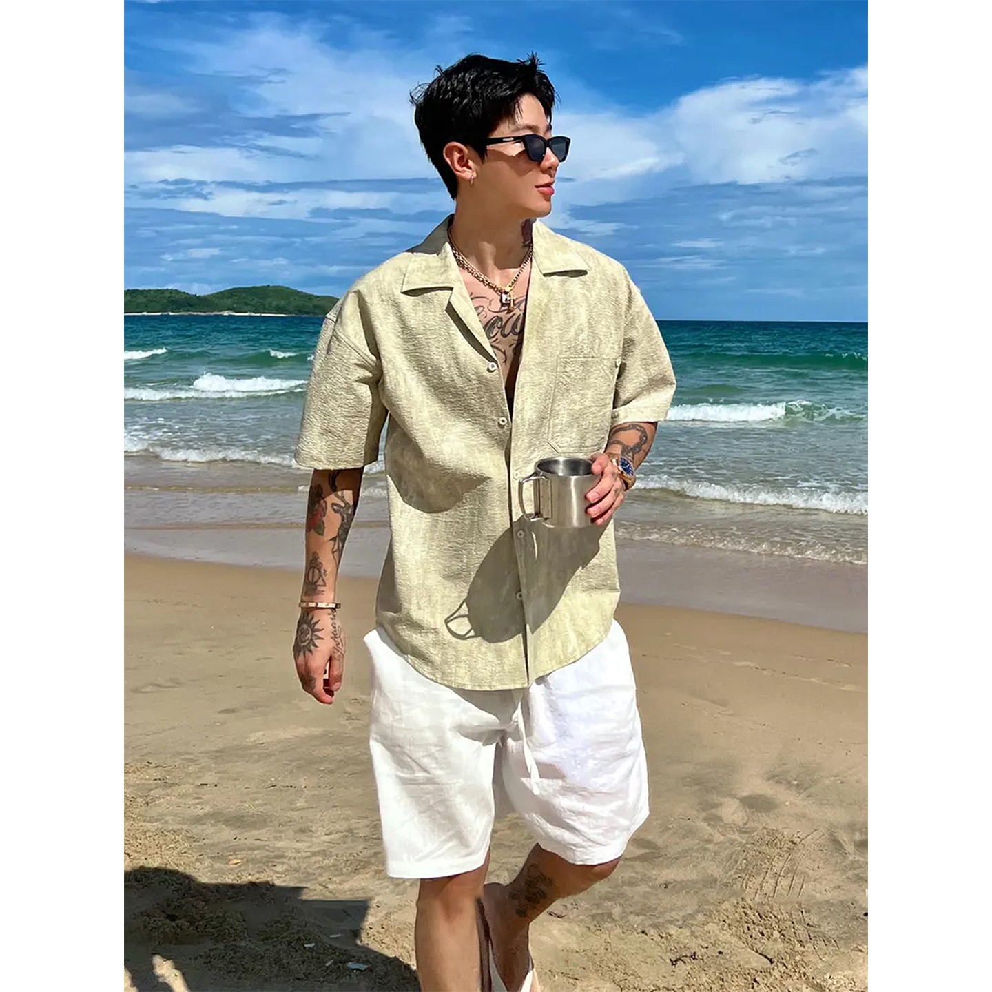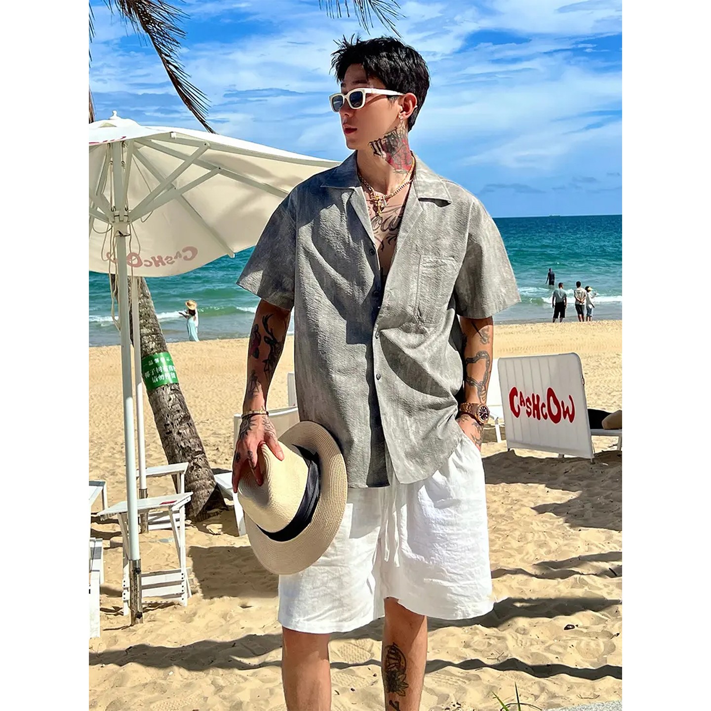 痞帅高级感休闲男装 美式 男夏季 衬衫 古巴领衬衣 黑色肌理感提花短袖