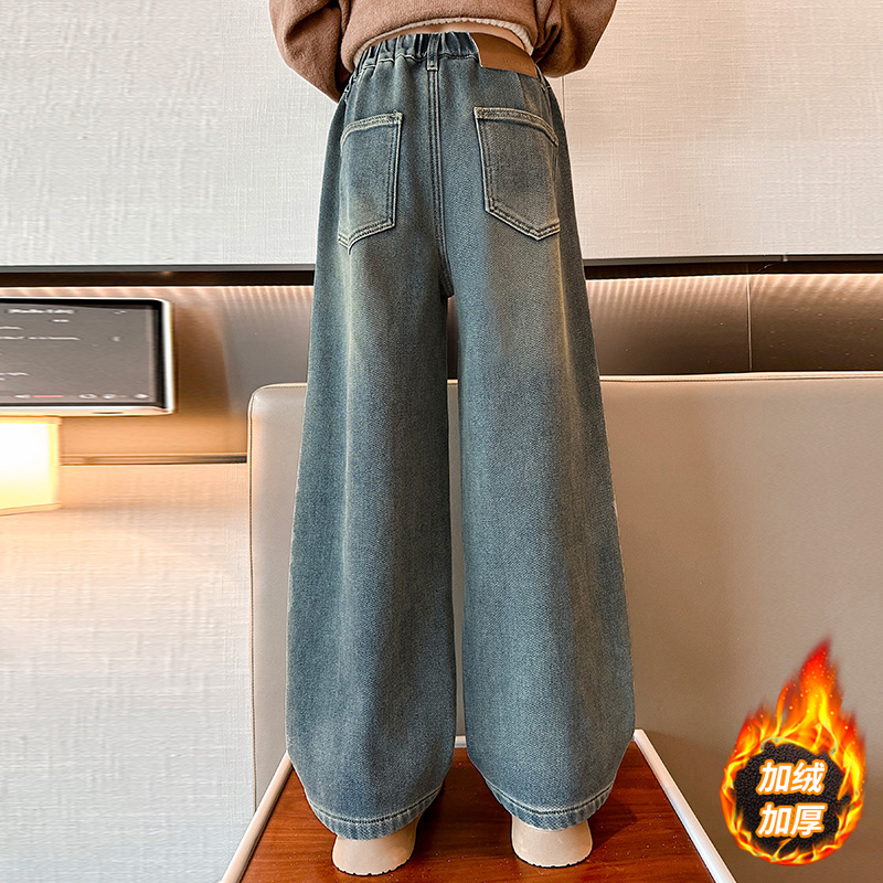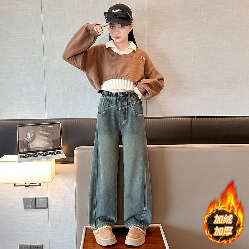 冬装 裤 2025新款 儿童冬季 子 女大童加厚一体绒直筒裤 女童加绒牛仔裤