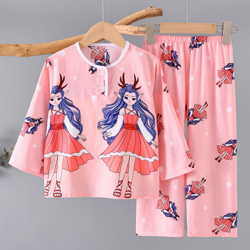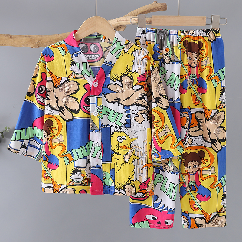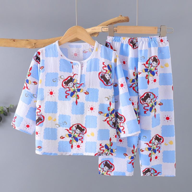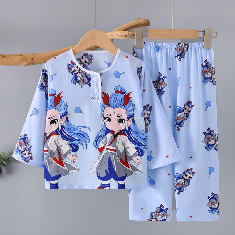 中大童空调服套装 夏季 男童棉绸睡衣儿童绵绸家居服男孩莱赛尔薄款