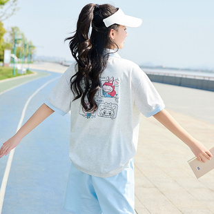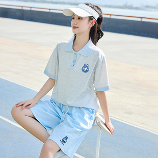 大童15岁女生绣花上衣 少女夏季 初中生polo领短袖 T恤休闲运动套装