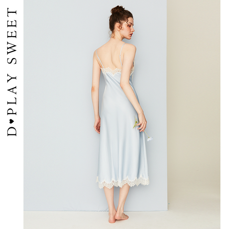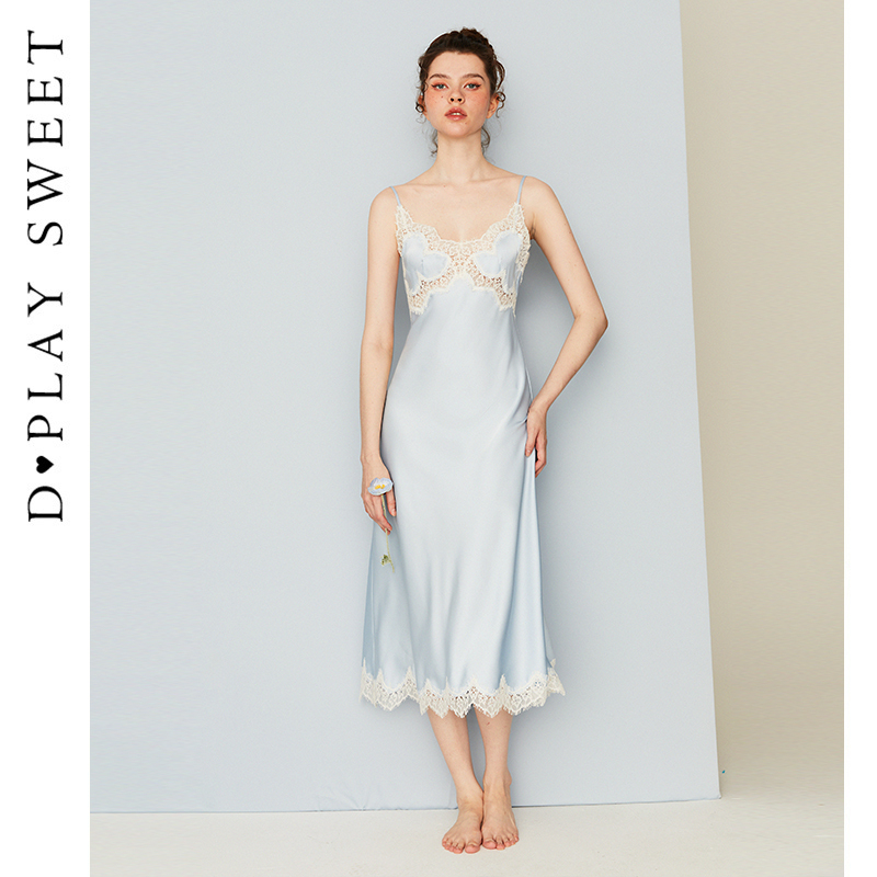 DPLAYSWEET法式 睡衣2025秋 浪漫蓝色撞色蕾丝缎面吊带睡裙女士长款