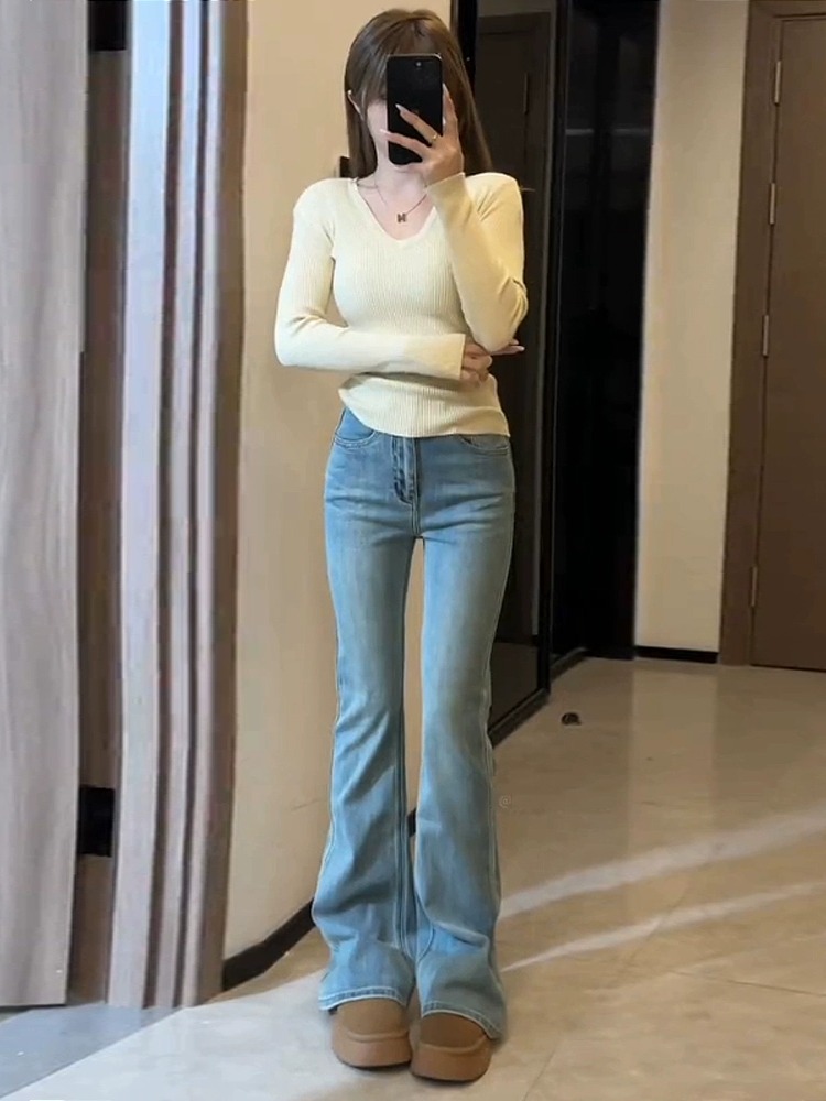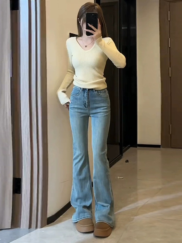 子女 高腰显瘦弹力拖地马蹄喇叭裤 浅色微喇牛仔裤 女春秋2024年新款