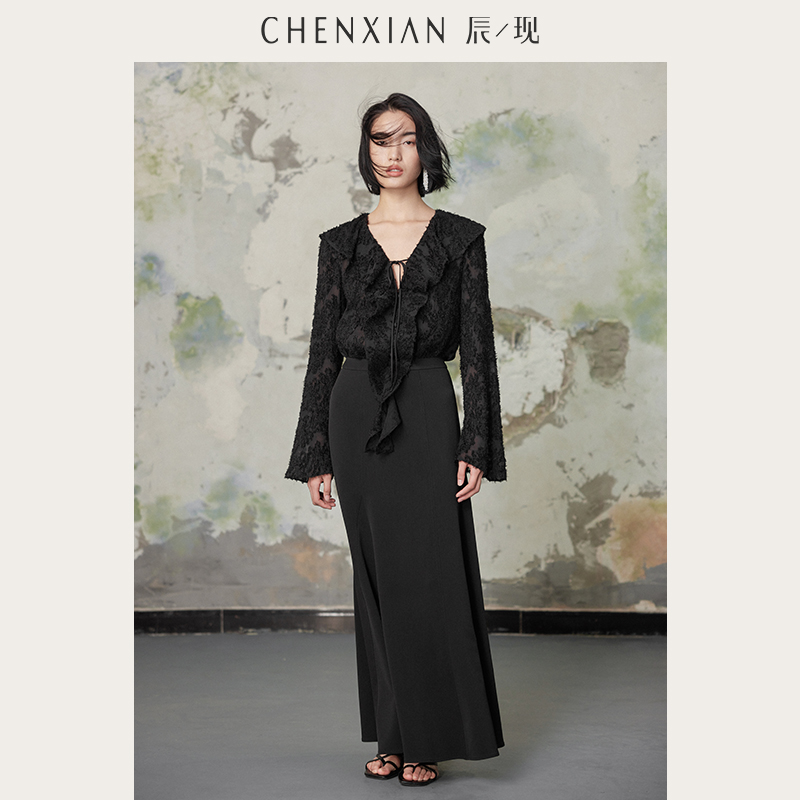 衬衣上衣女春 新中式 CHENXIAN辰现羽毛荷叶V领白黑色长袖 雪纺衬衫