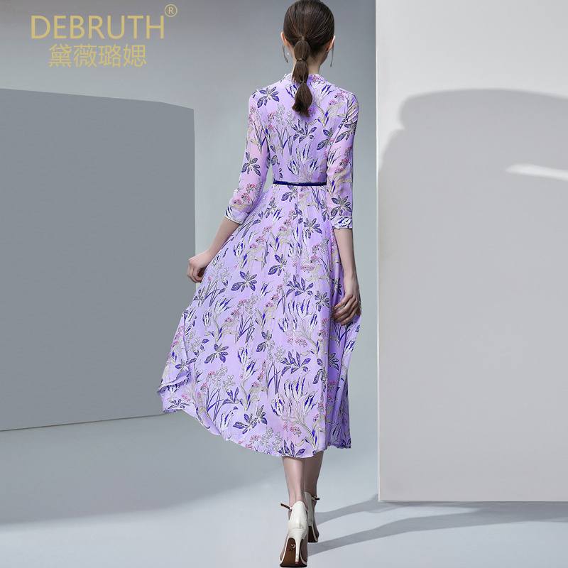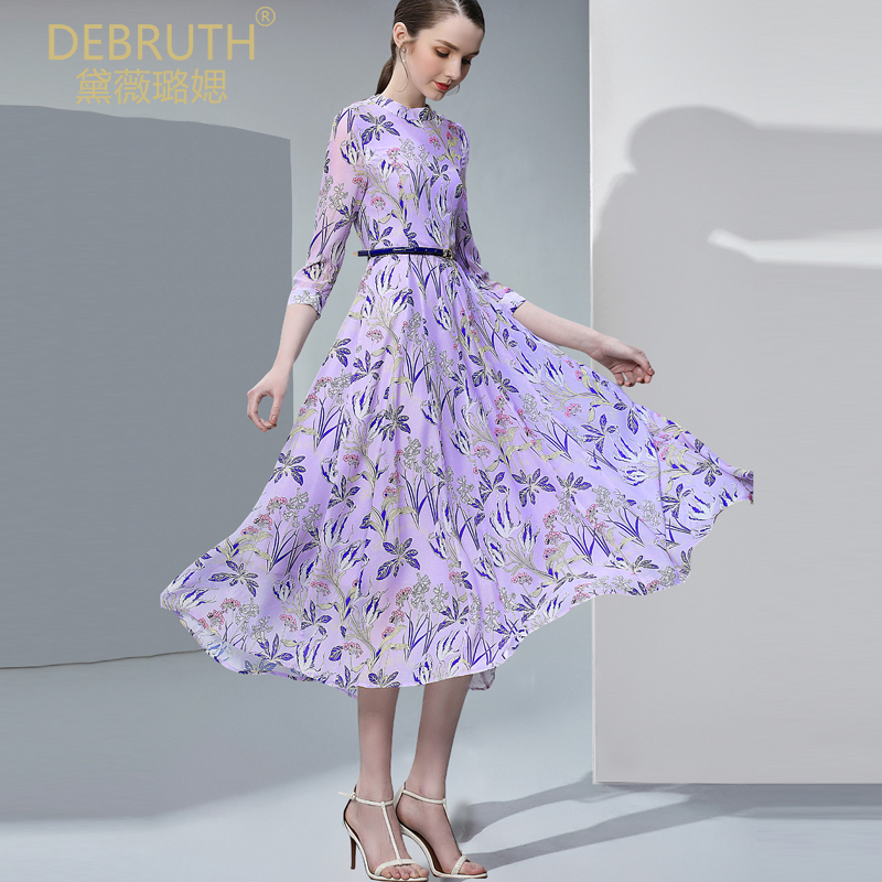 气质收腰A裙紫 2025秋新款 黛薇璐媤印花雪纺七分袖 连衣裙女中长款