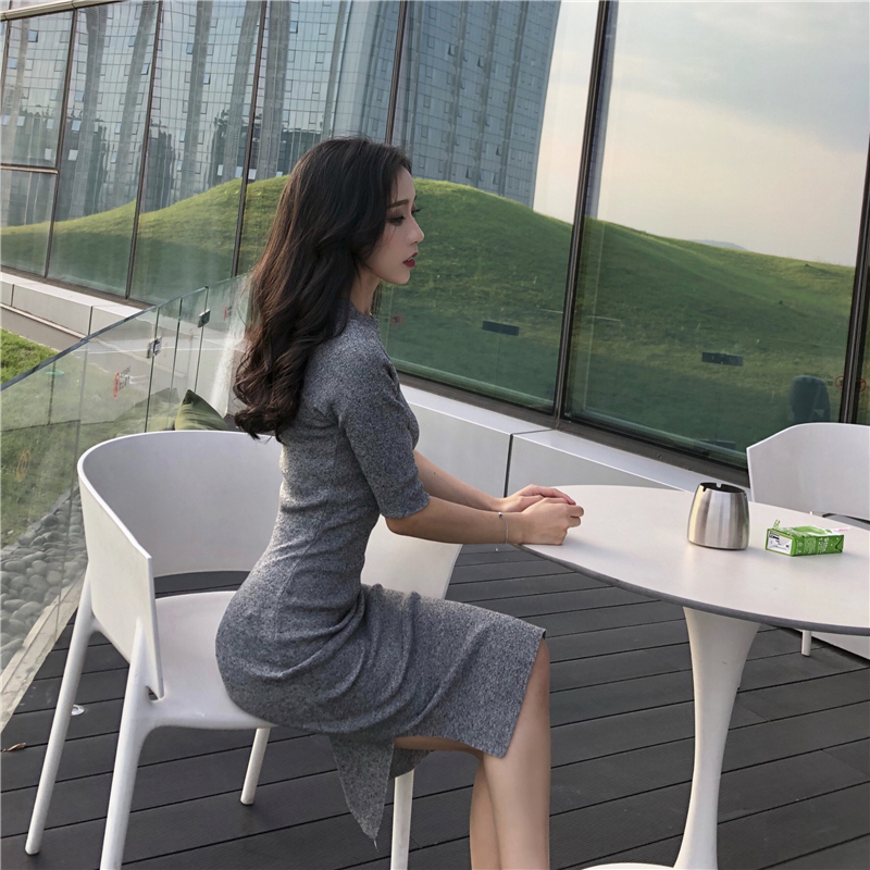 女秋打底包臀裙内搭辣妹气质黑色紧身毛衣针织连衣裙性感显瘦开叉