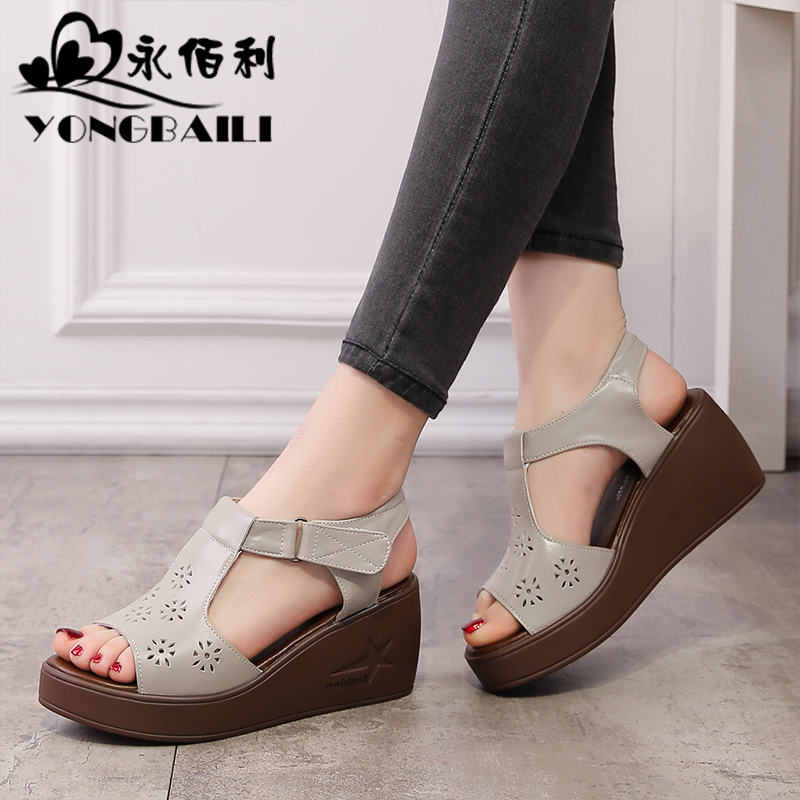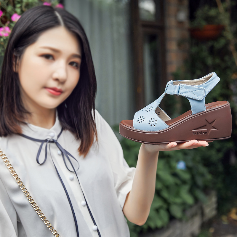 新款 皮鞋 时尚 女休闲松糕坡跟女鞋 镂空厚底高跟牛皮凉鞋 2025夏季