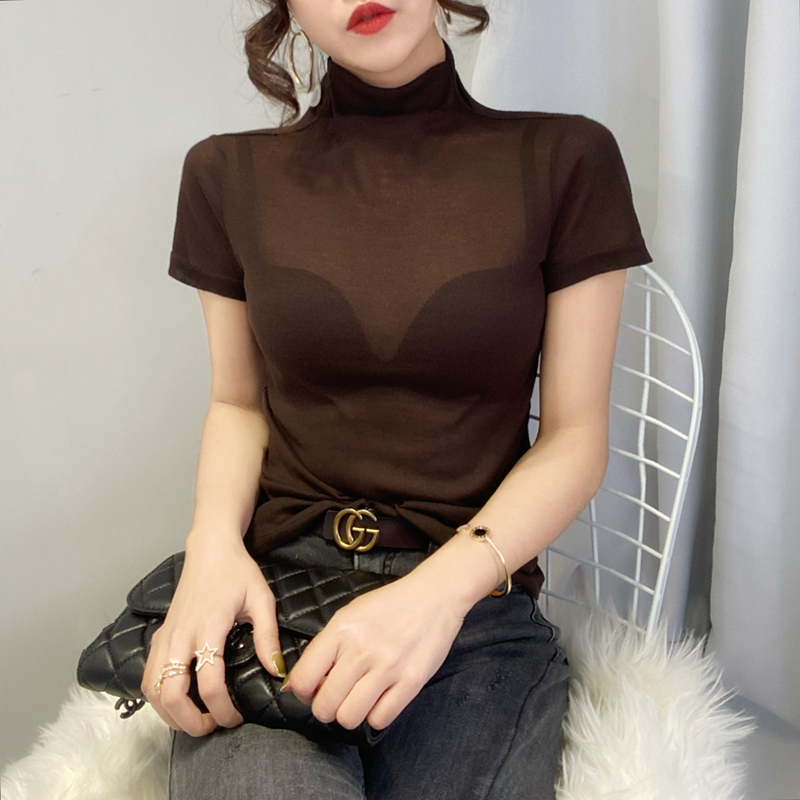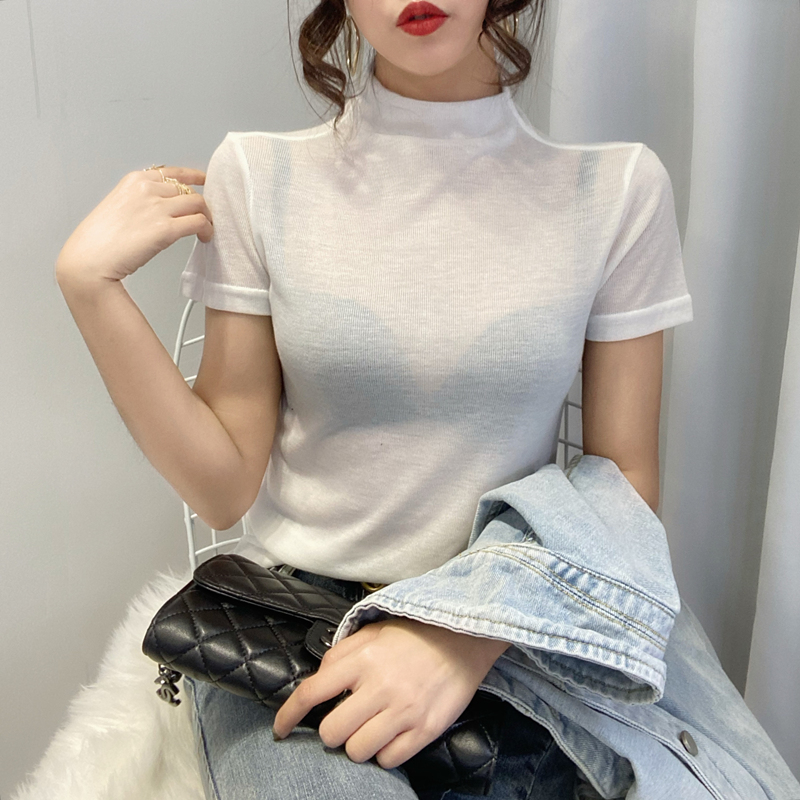 内搭薄款 微透性感网红打底衫 冰丝上衣超薄潮 修身 半高领t恤女短袖