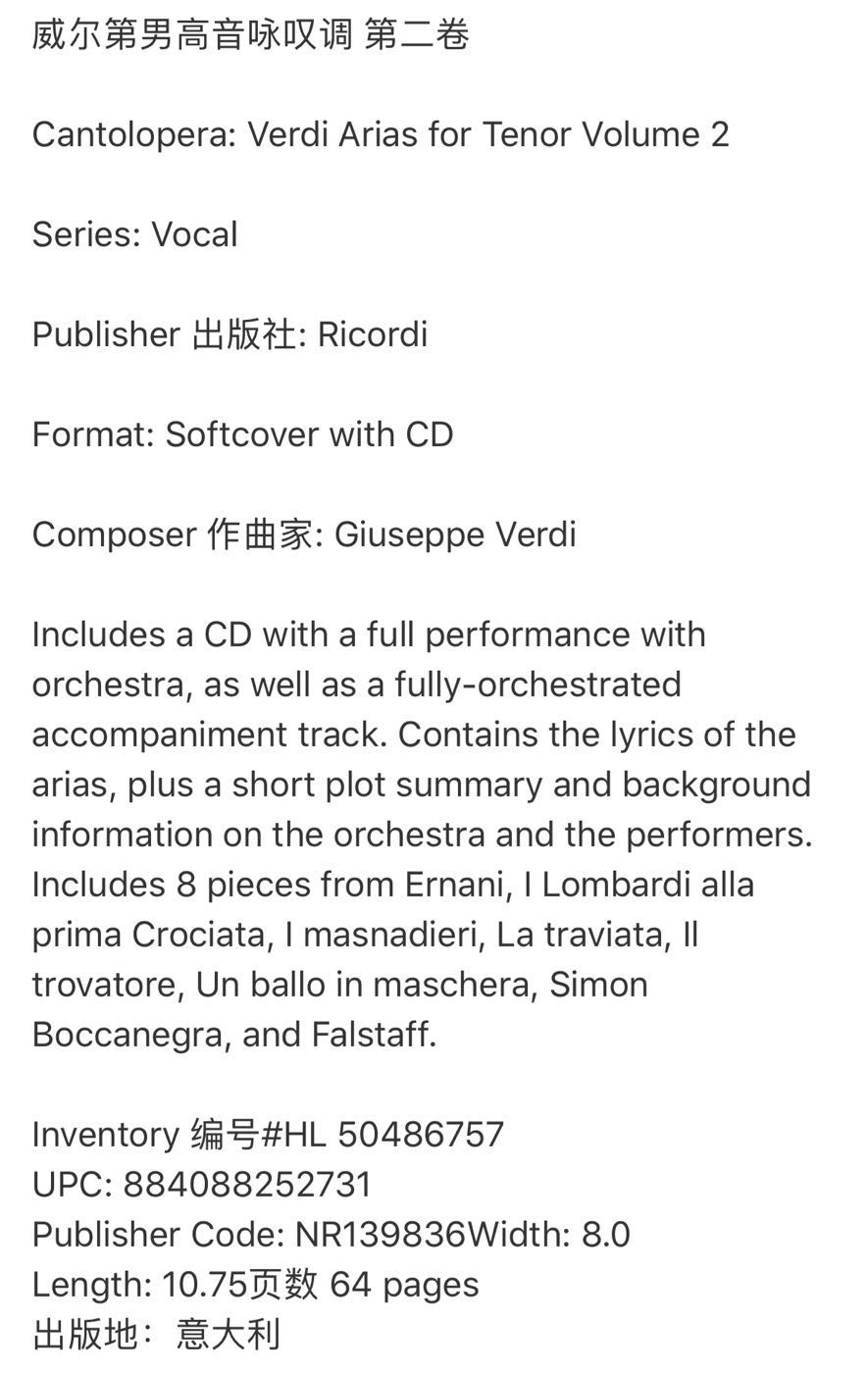 附CD 50486757 HL50484018 Arias 男高音咏叹调 声乐 Tenor 里科尔迪Ricordi原版 全套共一至二卷 Score 威尔第 乐谱书 Vocal Verdi