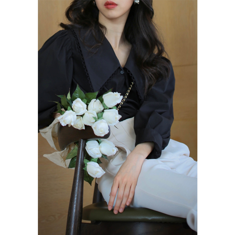 衬衣21017 衬衫 无有无印气质大领百搭黑色v领宽松泡泡袖 长袖