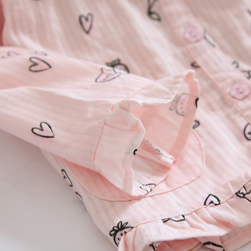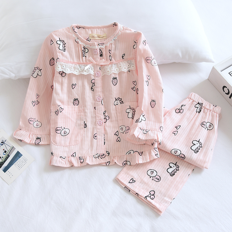 睡衣夏季 纯棉纱布儿童女童长袖 空调服a类清新家居服 春秋薄款 日式