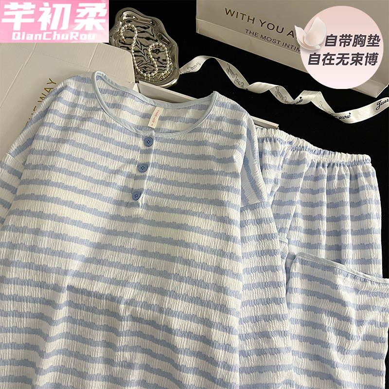 短袖 纯棉2025春夏新款 家居服女士带胸垫 女款 休闲风凉感棉睡衣套装