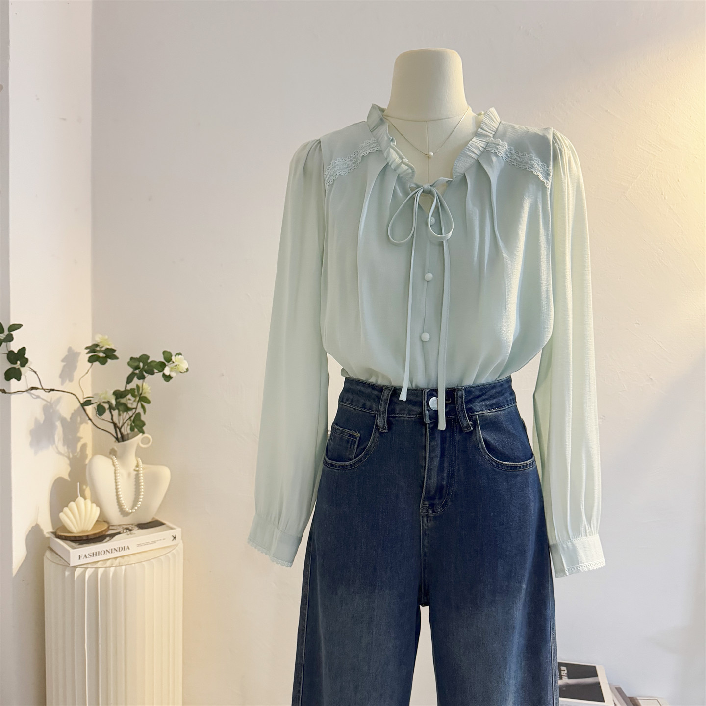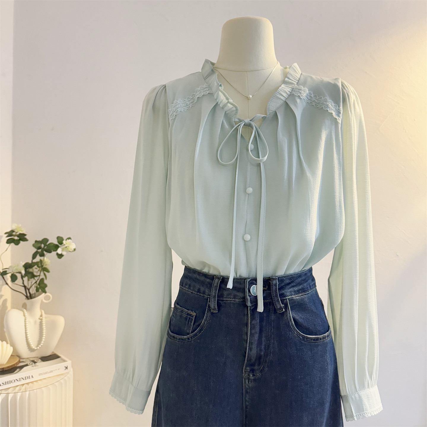 女长袖 衬衫 18345220 佐丹奴褶皱肌理拼接蕾丝圆领宽松法式 设计师款