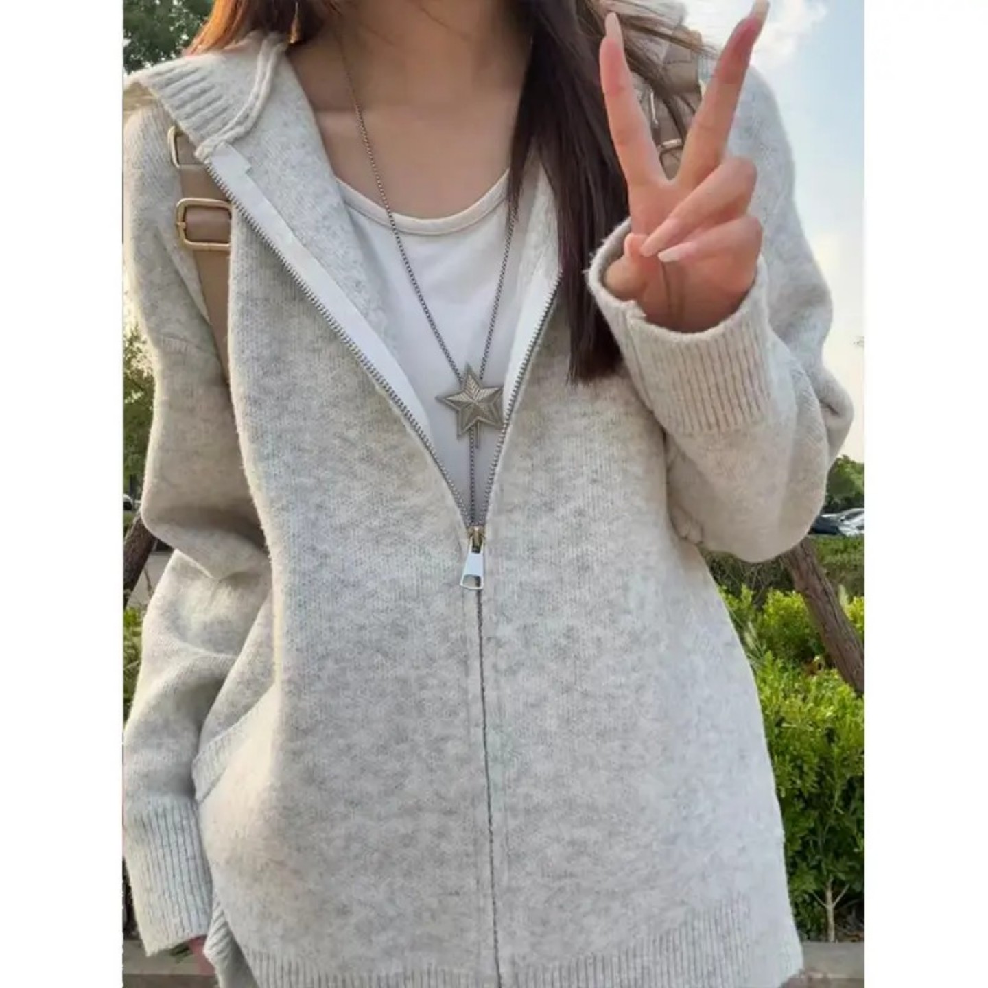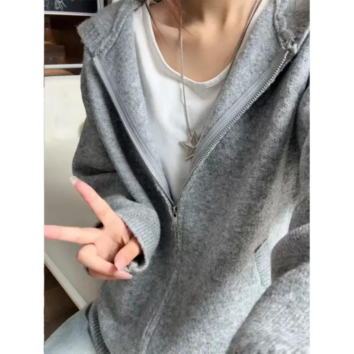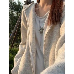 高级感灰色拉链连帽毛衣男秋季 老钱风情侣外套 宽松慵懒风针织开衫