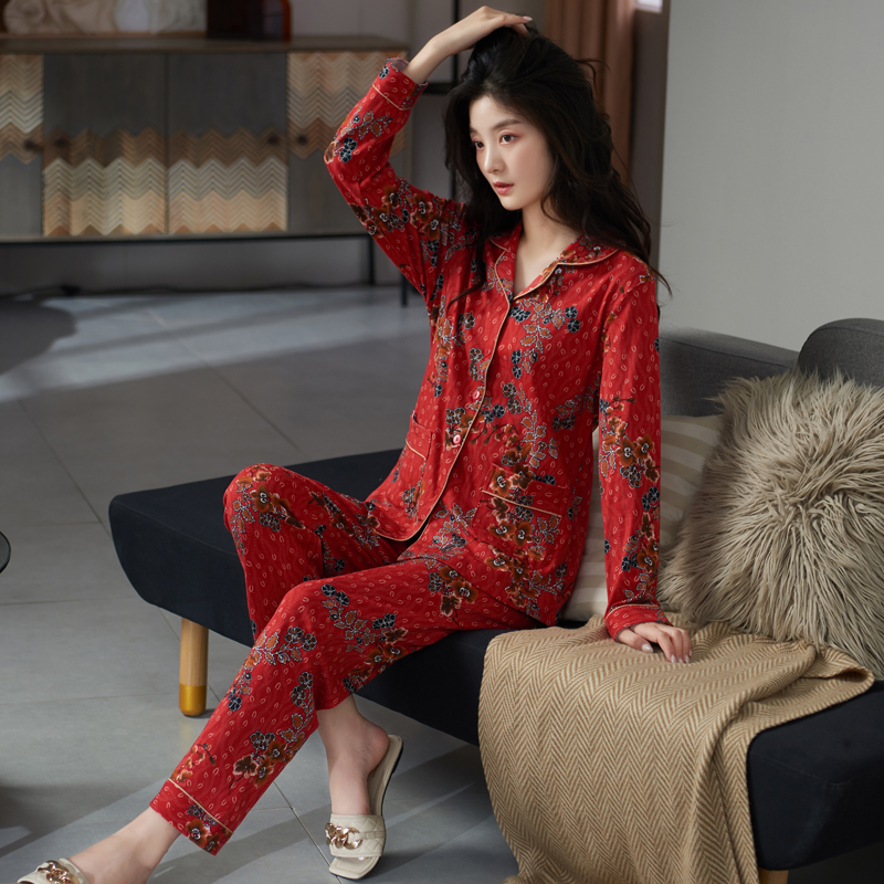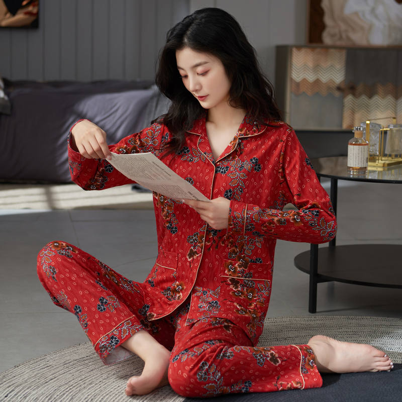 结婚新婚家居服套装 睡衣女春秋季 大码 碎花红色本命年开衫 纯棉长袖