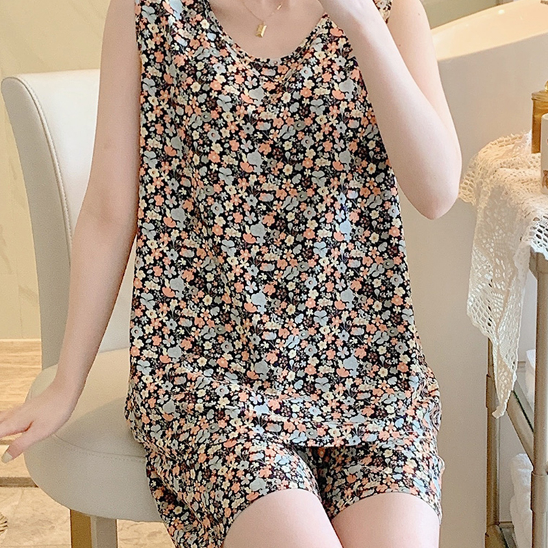 睡衣家居服甜美加大码 绵绸睡衣女夏季 人造棉绸薄款 套装 可外穿 无袖