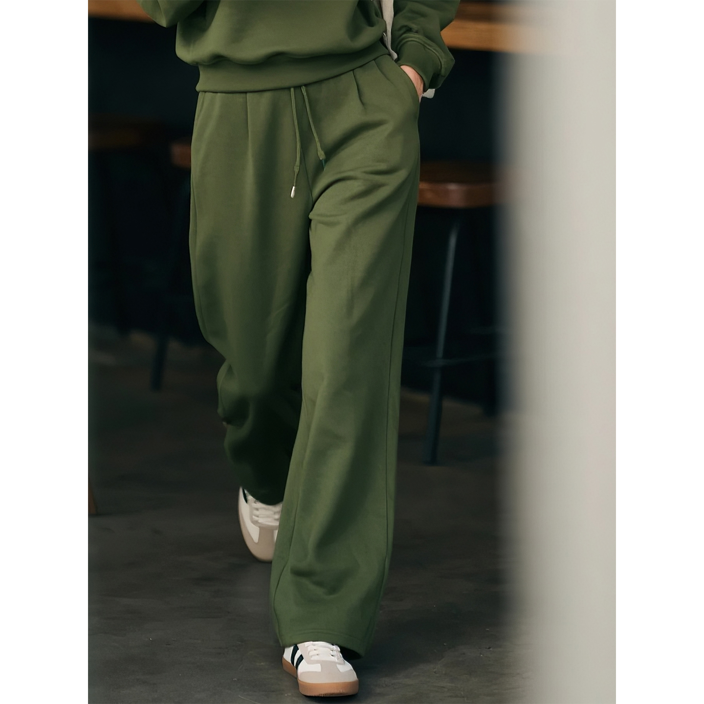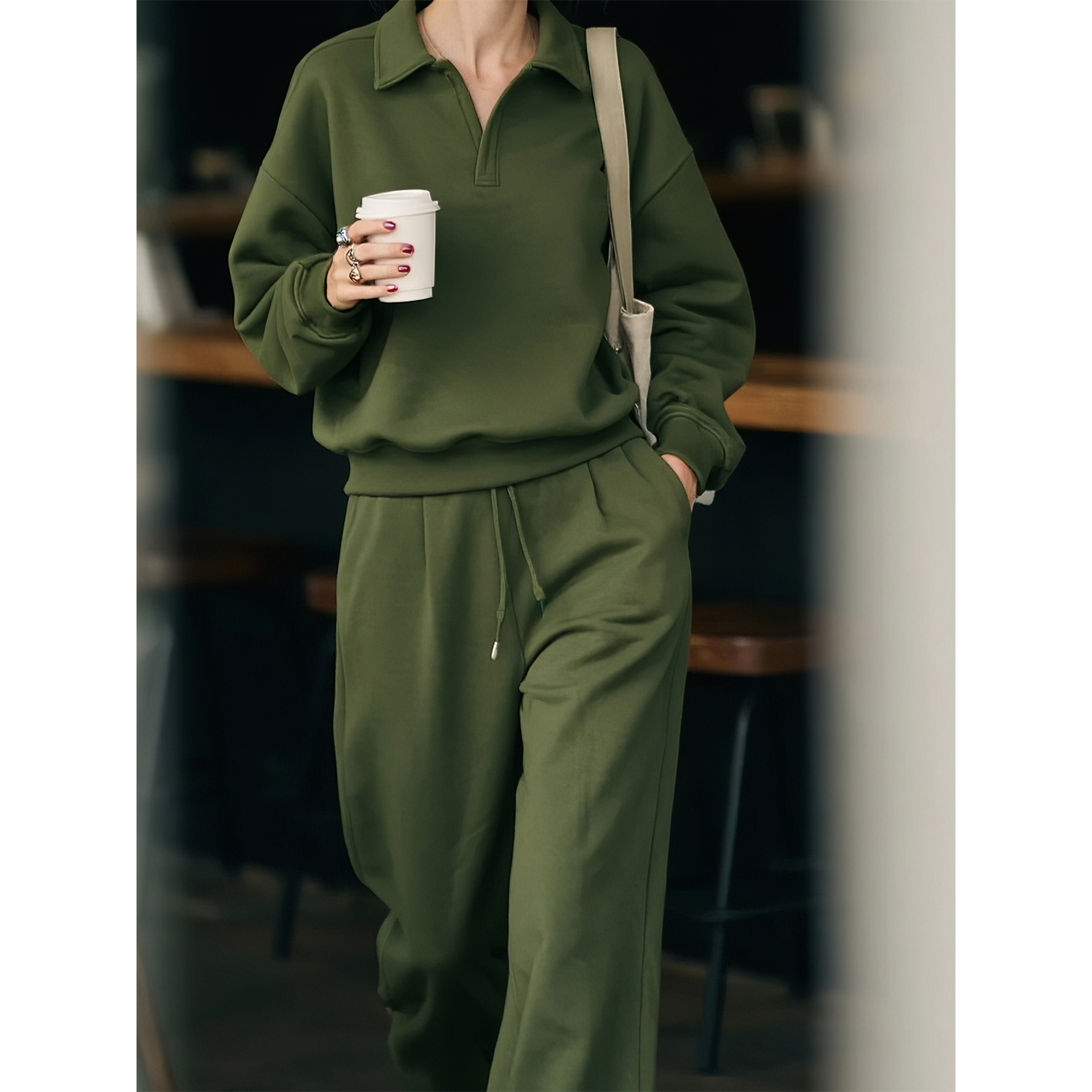翻领卫衣百搭阔腿裤 新款 两件套 女2025年秋季 军绿色早秋休闲套装