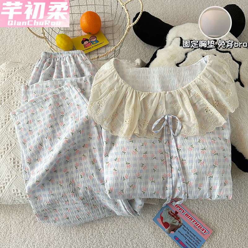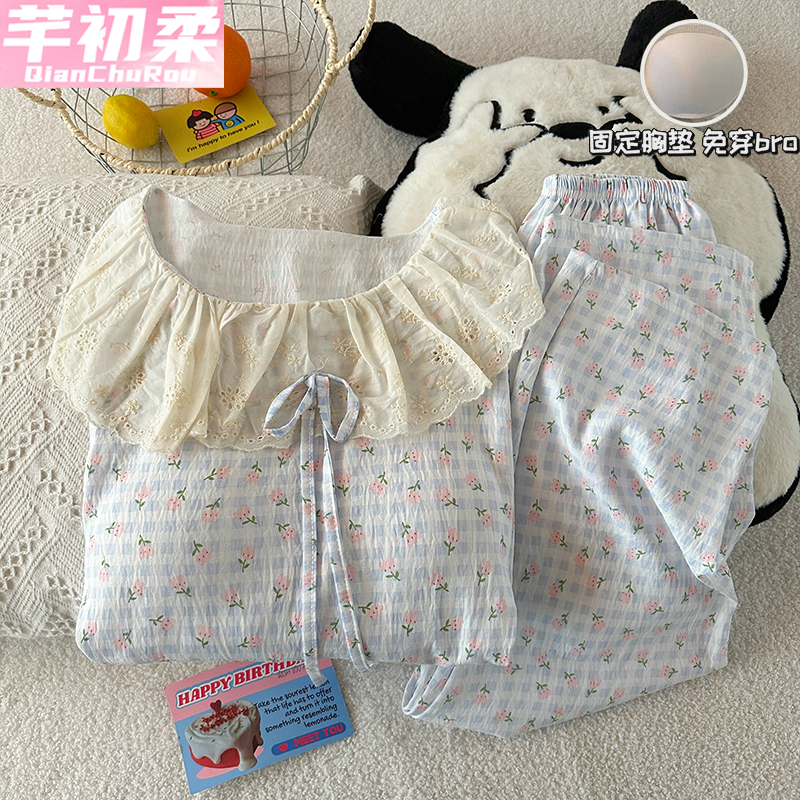 半边绒刺绣ins家居服套装 yso 新款 睡衣女冬季 花花梦园
