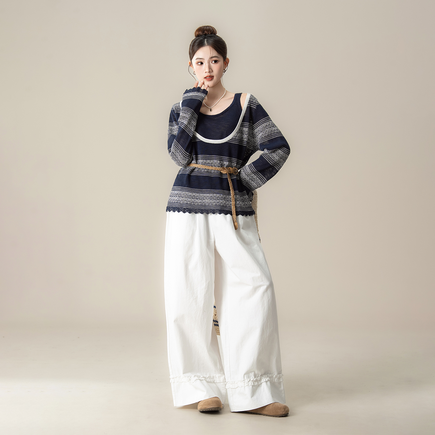 内搭吊带背心套装 新款 配腰带 女秋季 藏青色波西米亚风防晒针织罩衫