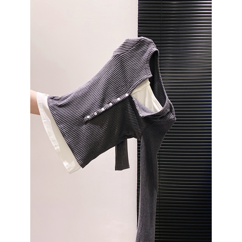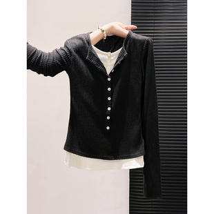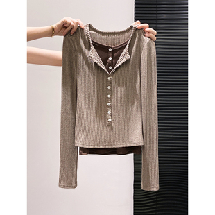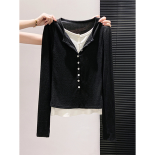 内搭打底衫 修身 t恤女外穿上衣2025早秋新款 撞色假两件半开领长袖