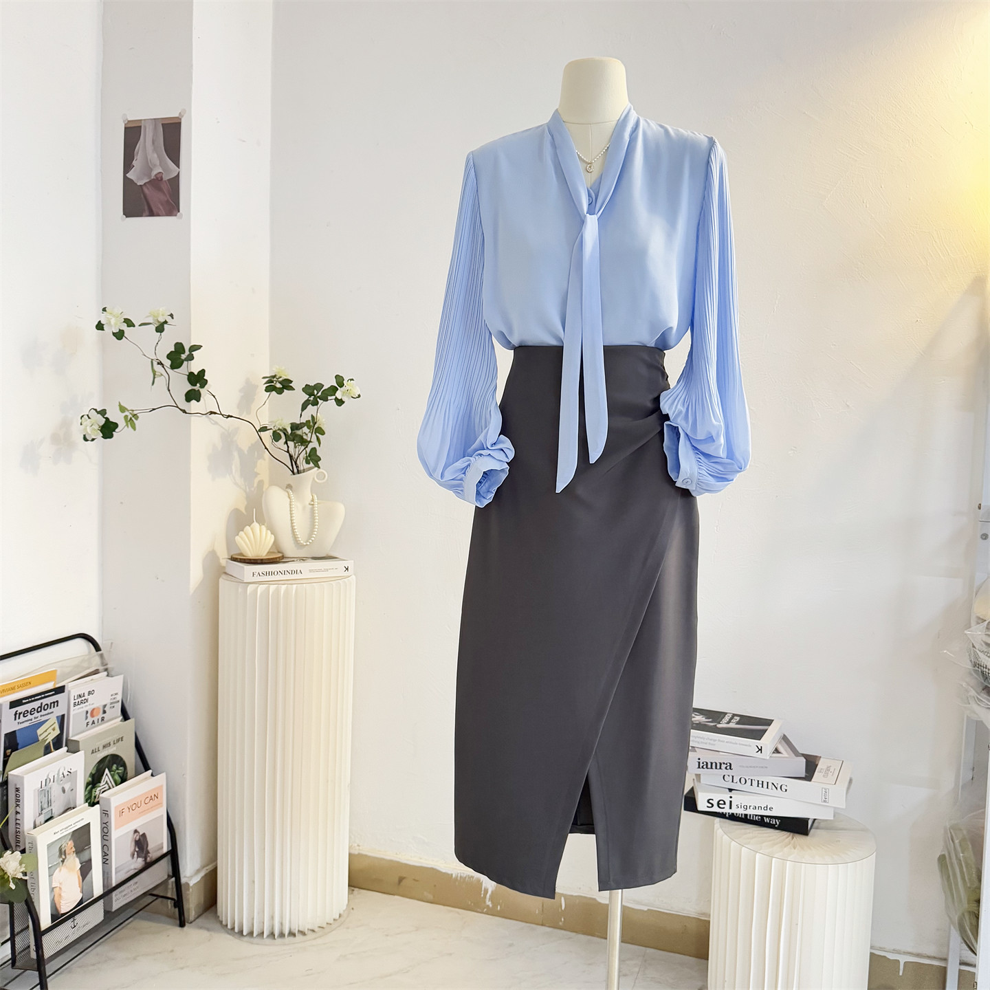 小衫 蓝色法式 女2025秋设计感风琴压褶灯笼袖 衬衫 V领飘带雪纺长袖