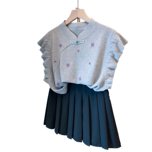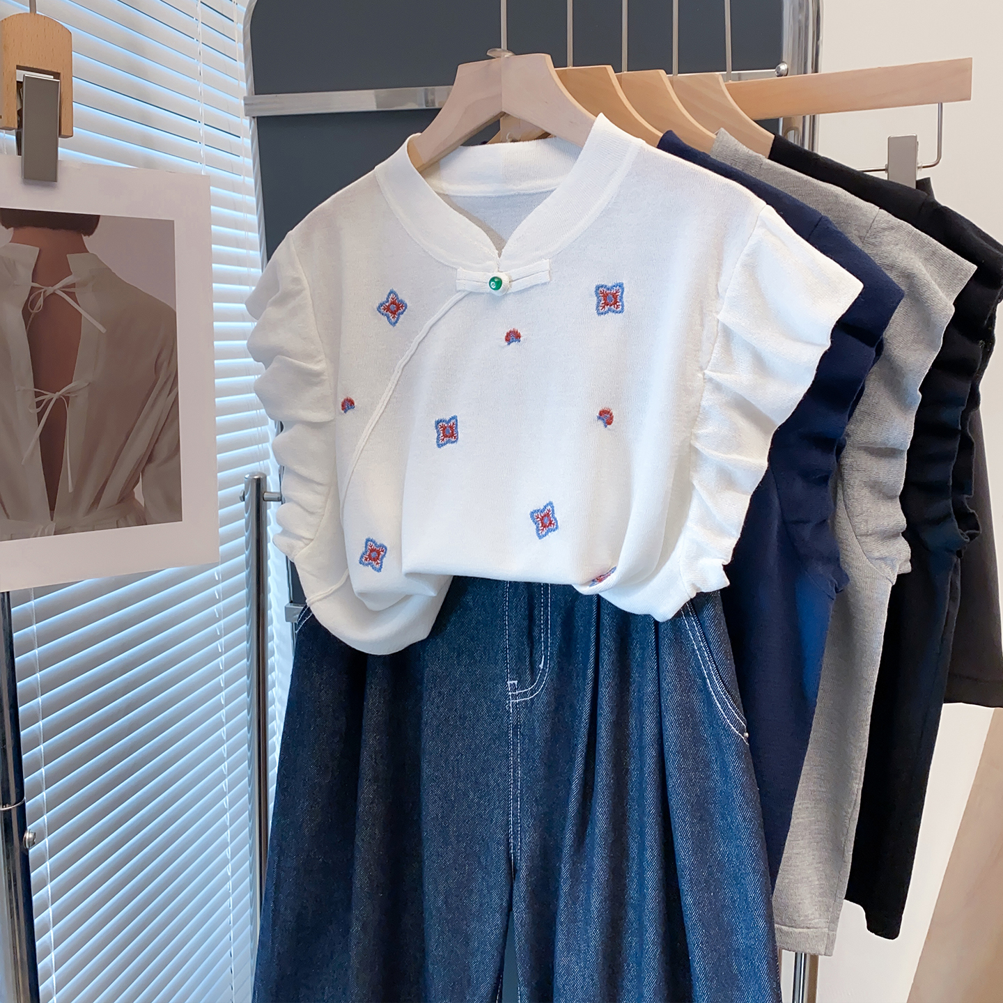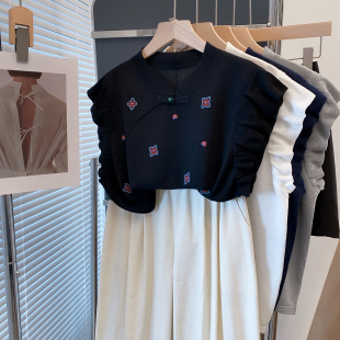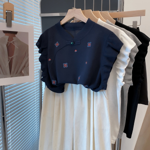宽松外穿上衣薄短袖 绣花旗袍领飞飞袖 新款 女2025夏装 t恤潮 针织衫