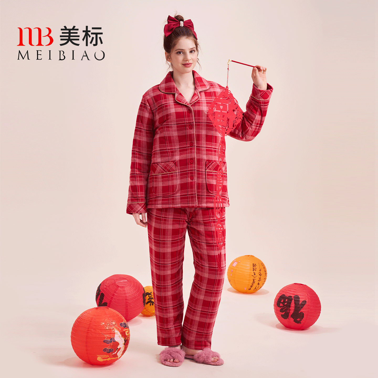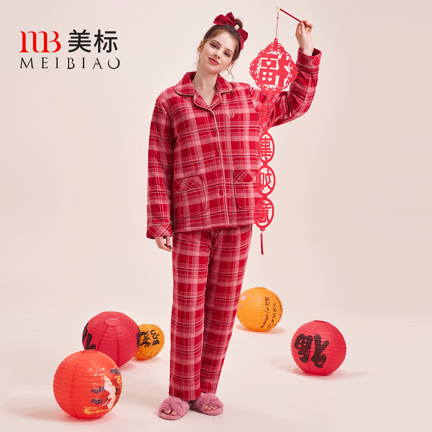 Gukoo 果壳睡衣女春秋格子简约女士全棉梭织格纹家居服套装