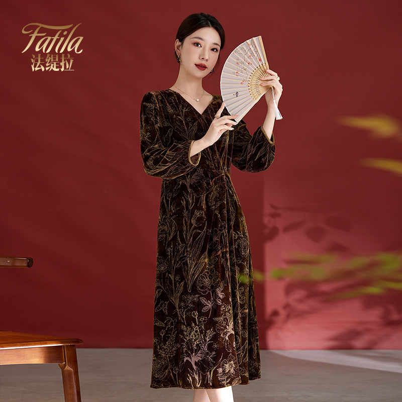 收腰显瘦中长款 长袖 优雅气质妈妈裙子 新款 v领真丝丝绒连衣裙秋装