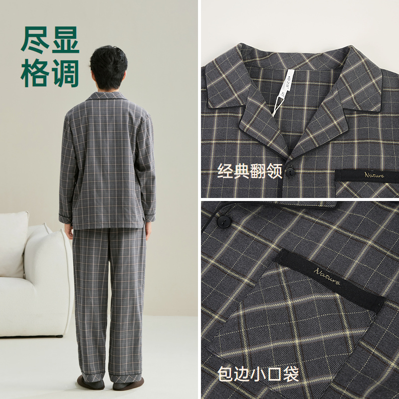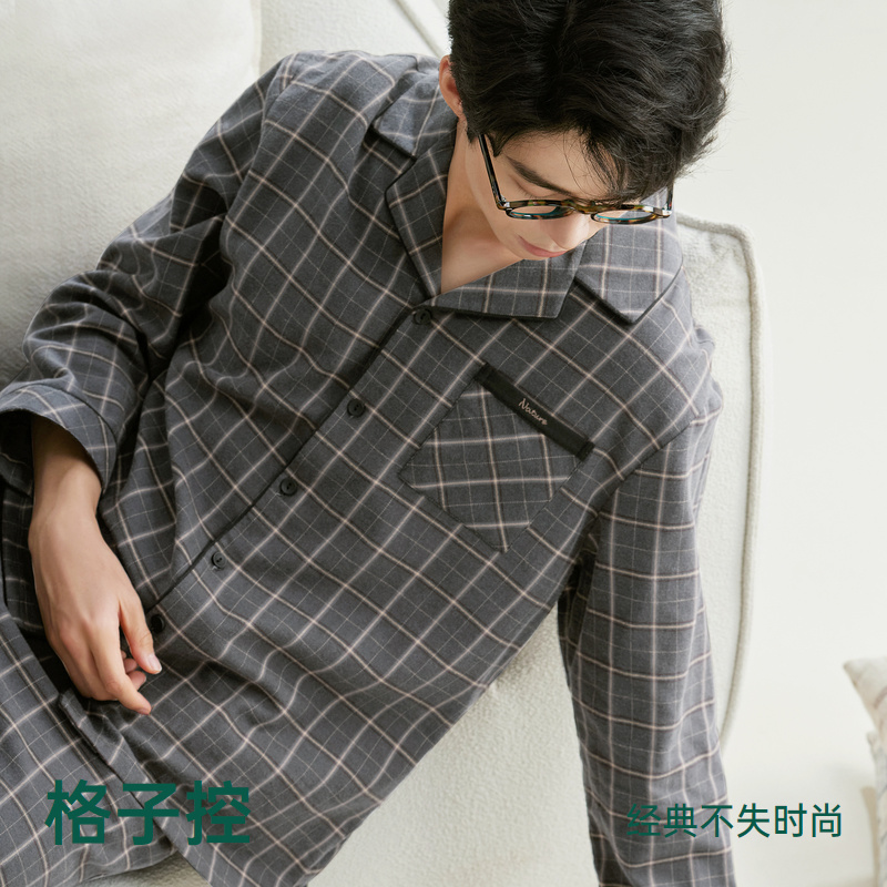 巨柔软 纯棉磨毛格纹家居服套装 男士 2025新款 睡衣春秋季 安之伴