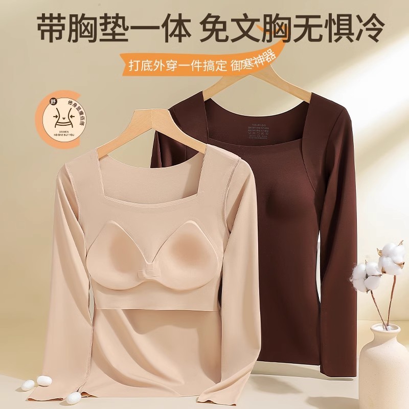 上衣 大领口秋衣内搭长袖 猫人保暖内衣女士带胸垫打底衫 2025秋冬季