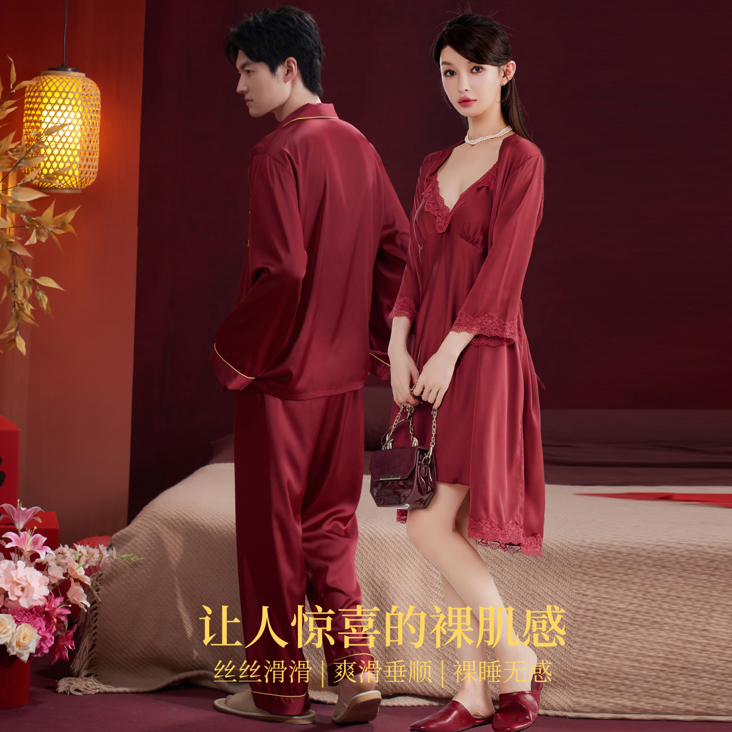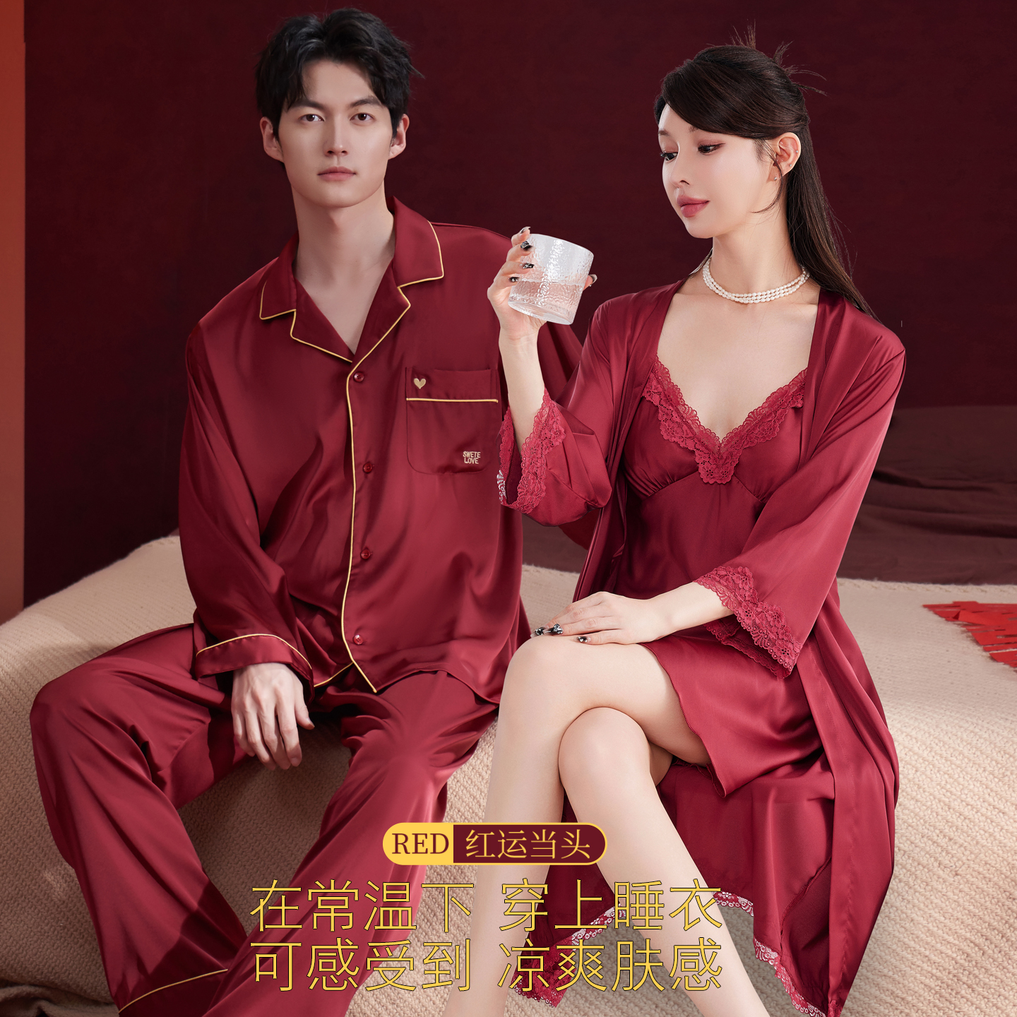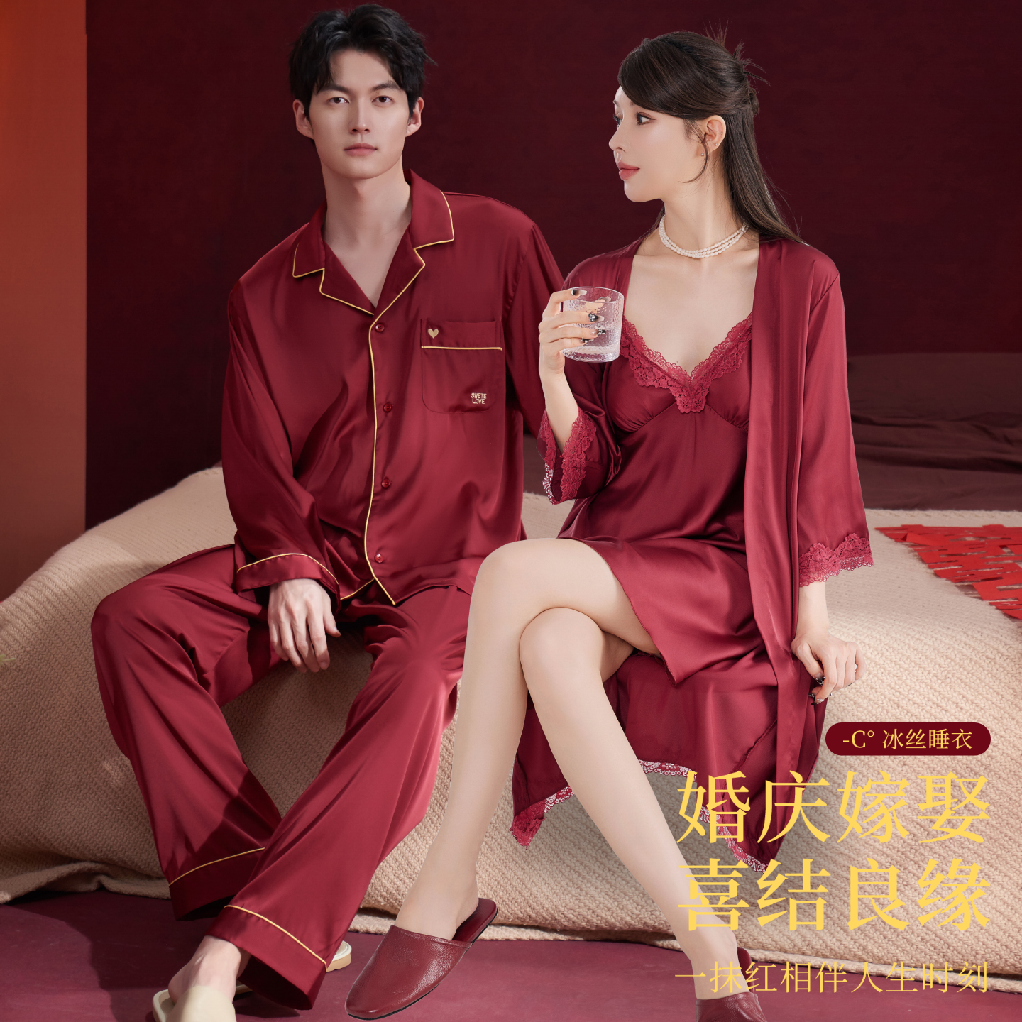 乐姿梦结婚睡衣新婚情侣套装 红色带胸垫 冰丝晨袍女新娘婚用春秋季