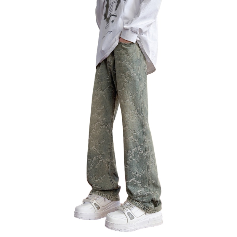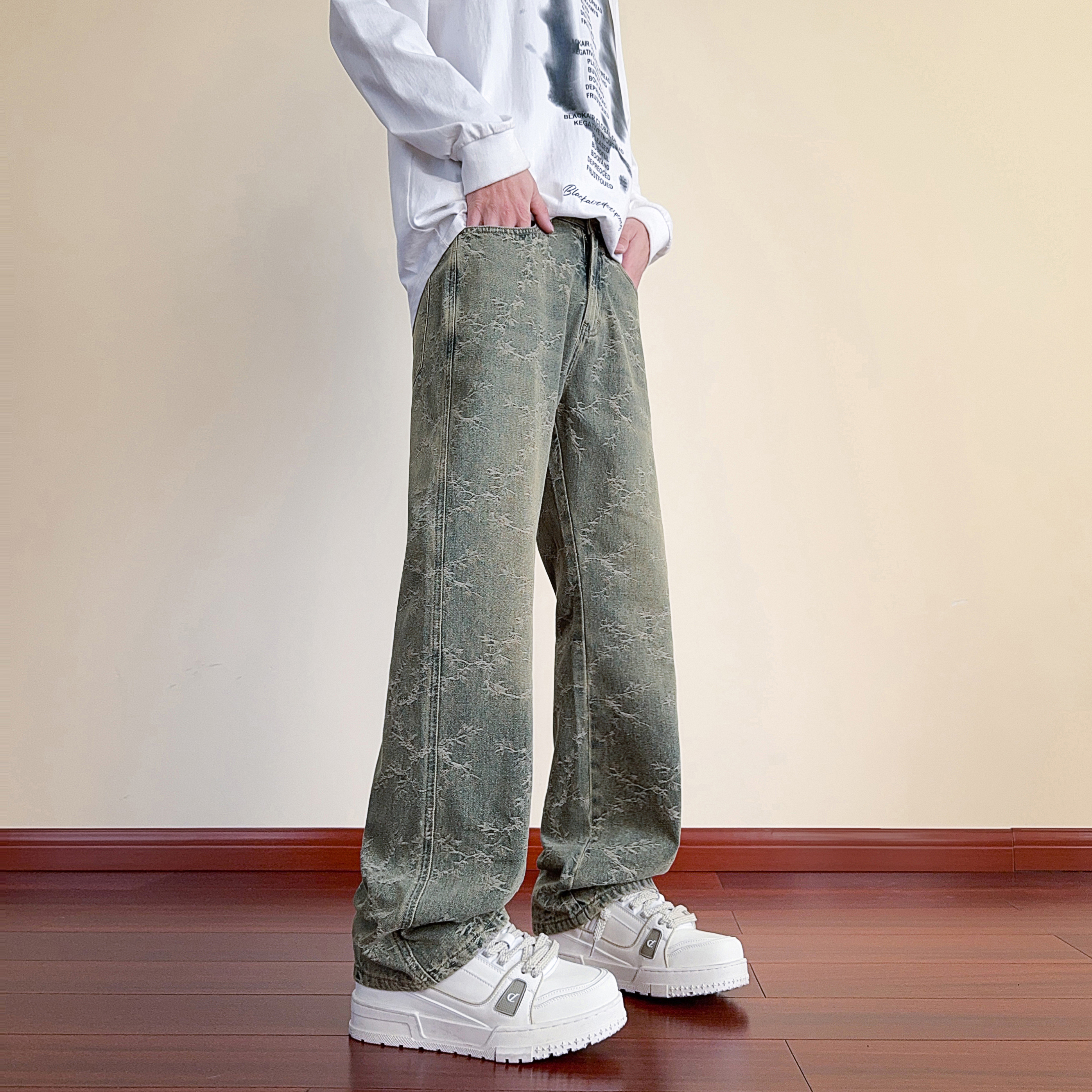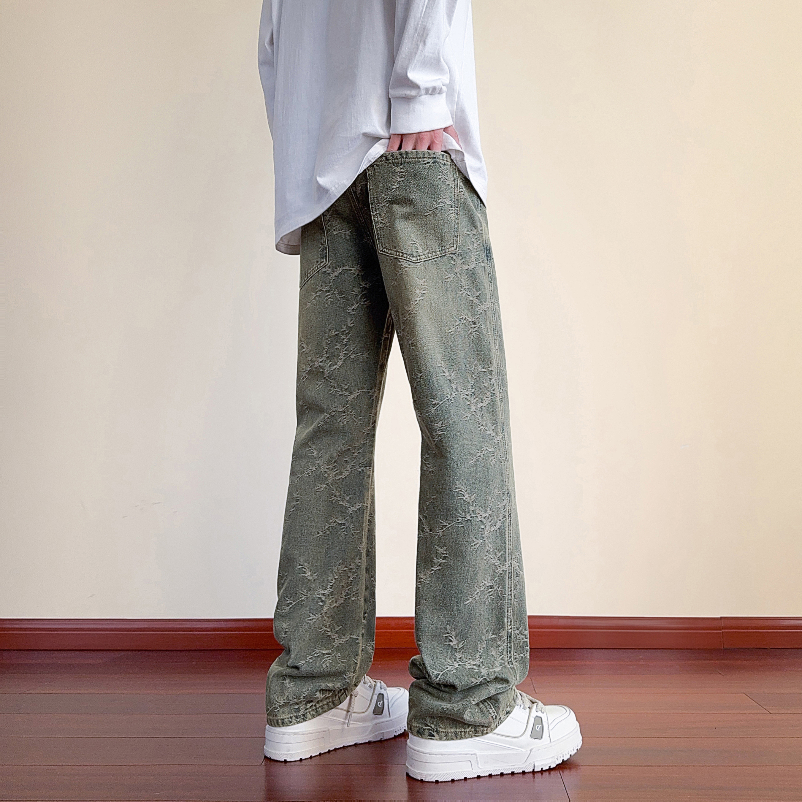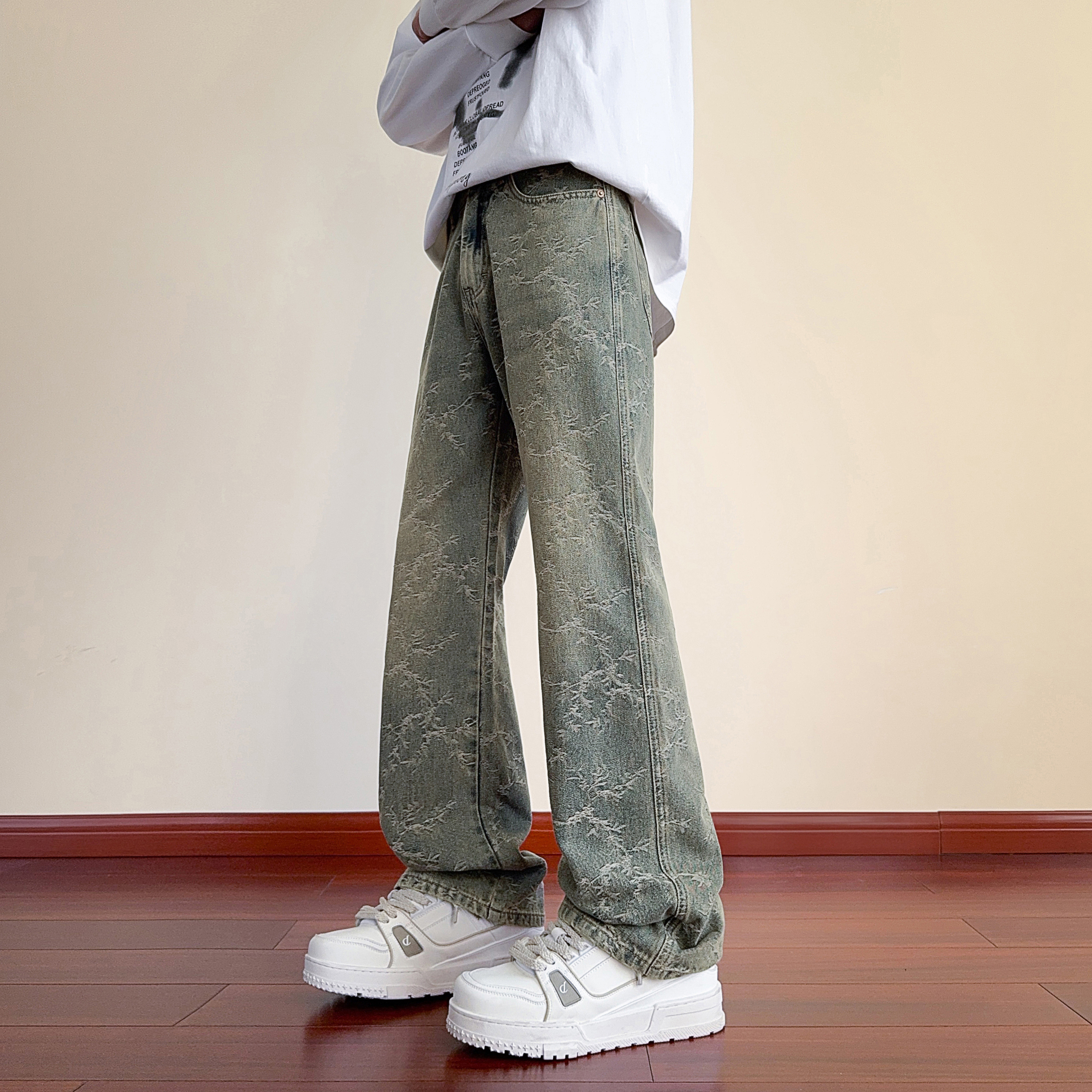 直筒宽松潮流复古长裤 男士 子男款 新款 美式 秋季 高街提花微喇牛仔裤