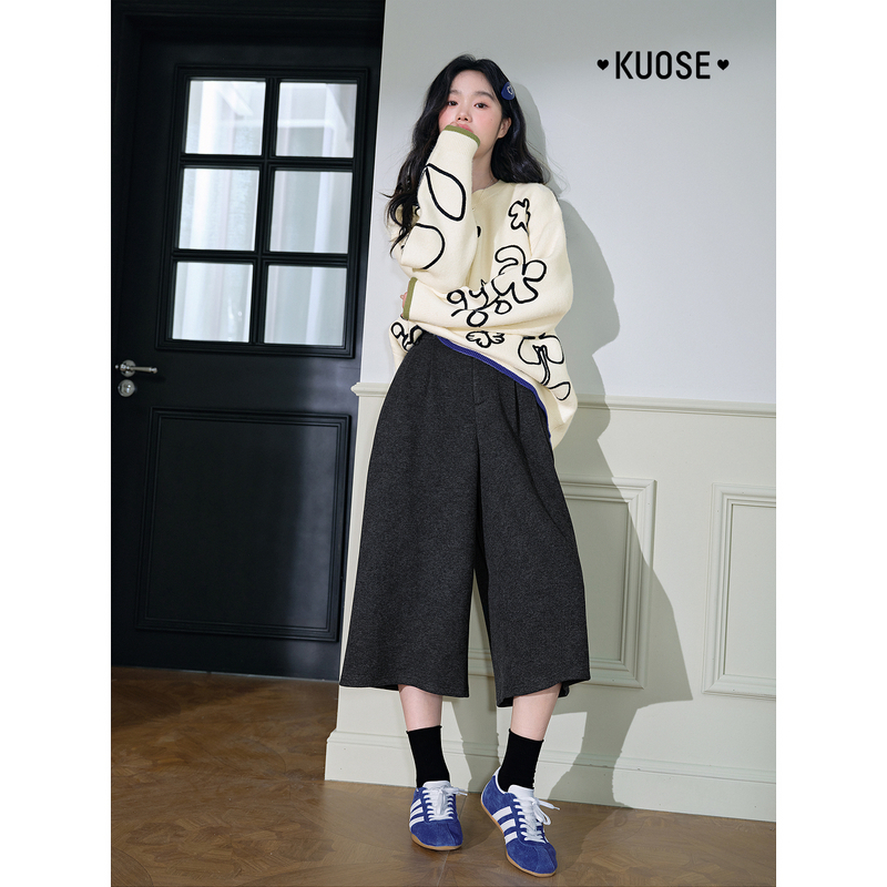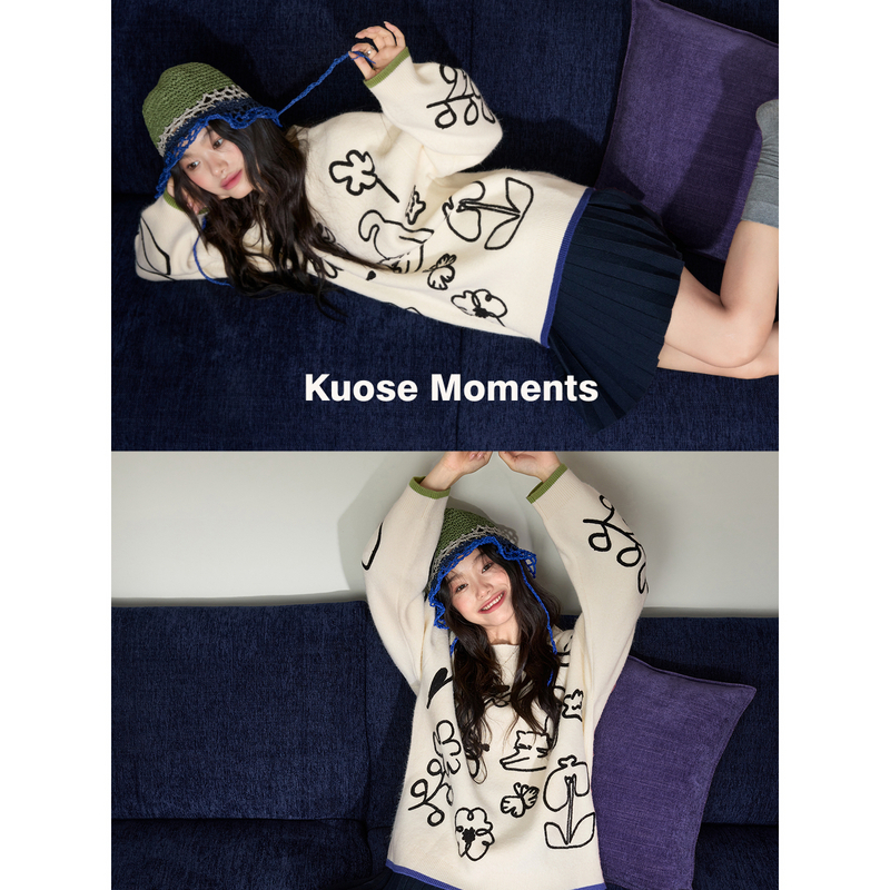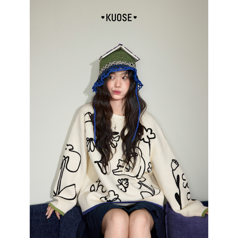 女碎花上衣 穿搭新款 阔色白色翻领polo领毛衣针织衫 2025秋冬季
