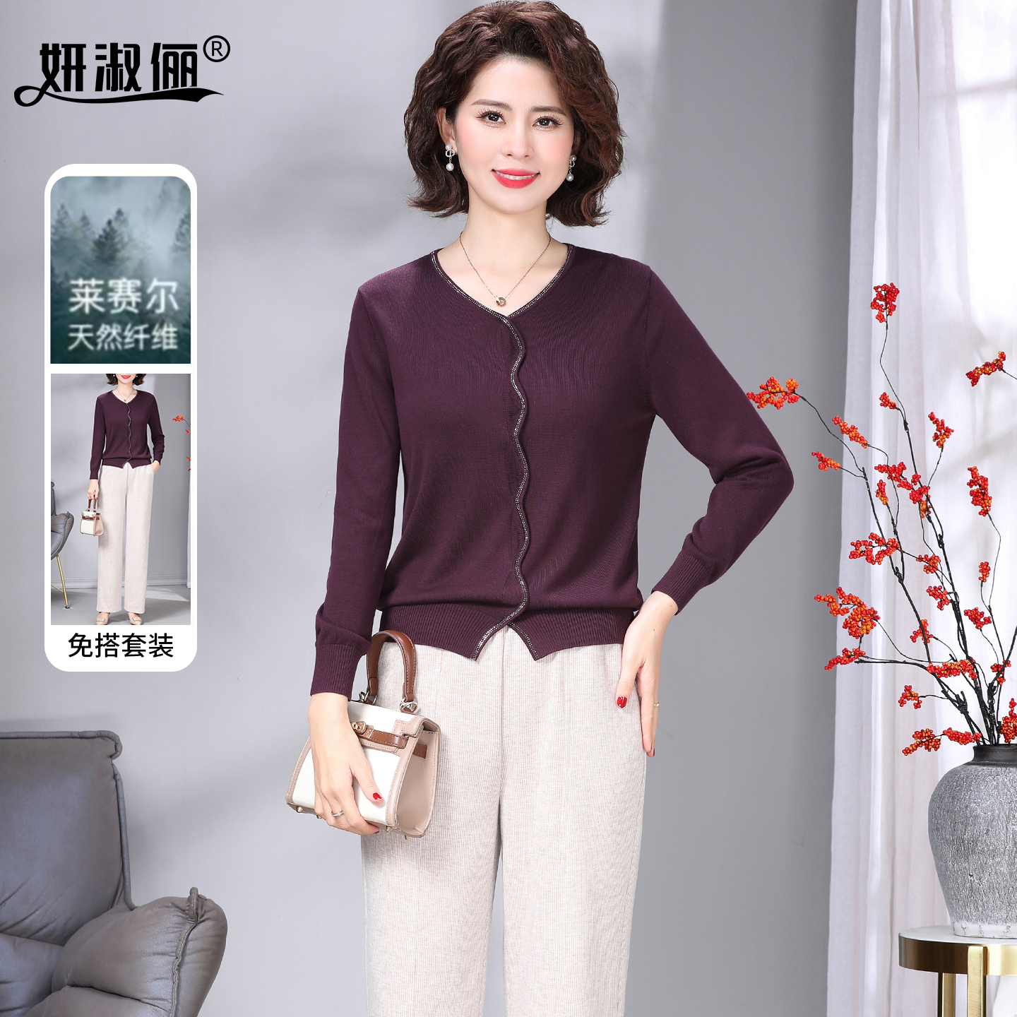 长袖 品牌莱赛尔针织衫 上衣女 天丝两件套洋气2025新款 中年妈妈秋装