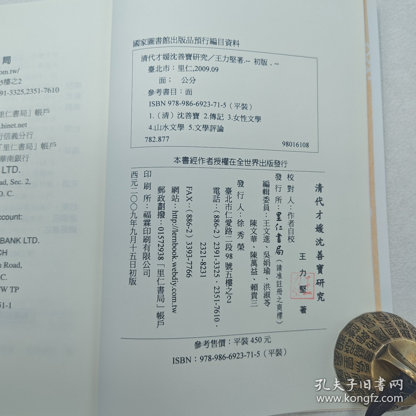 锁线胶订 2009年9月版 王力坚 正版 清代才媛沈善寶研究 台湾里仁书局 现货 港台原版