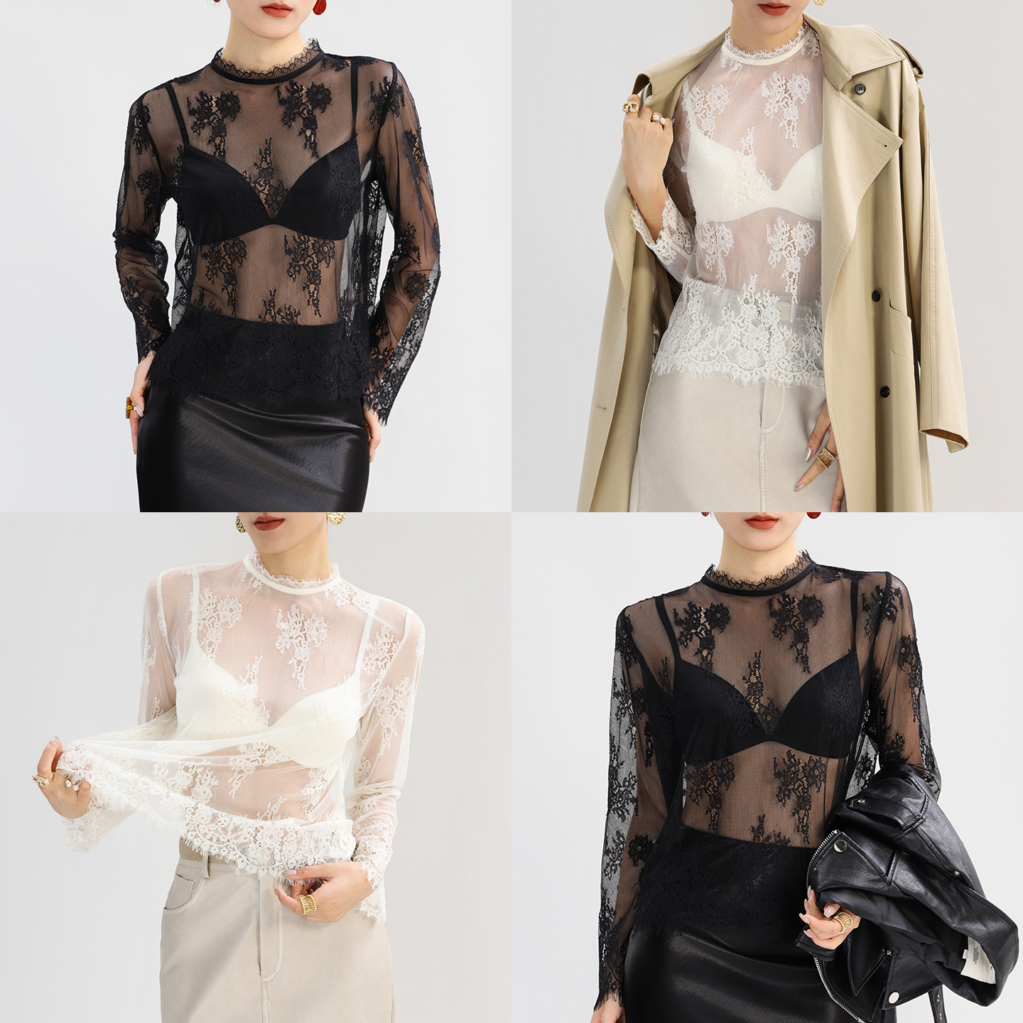 半高领黑色蕾丝打底衫 女独特漂亮叠穿透明网纱上衣高级感花边内搭