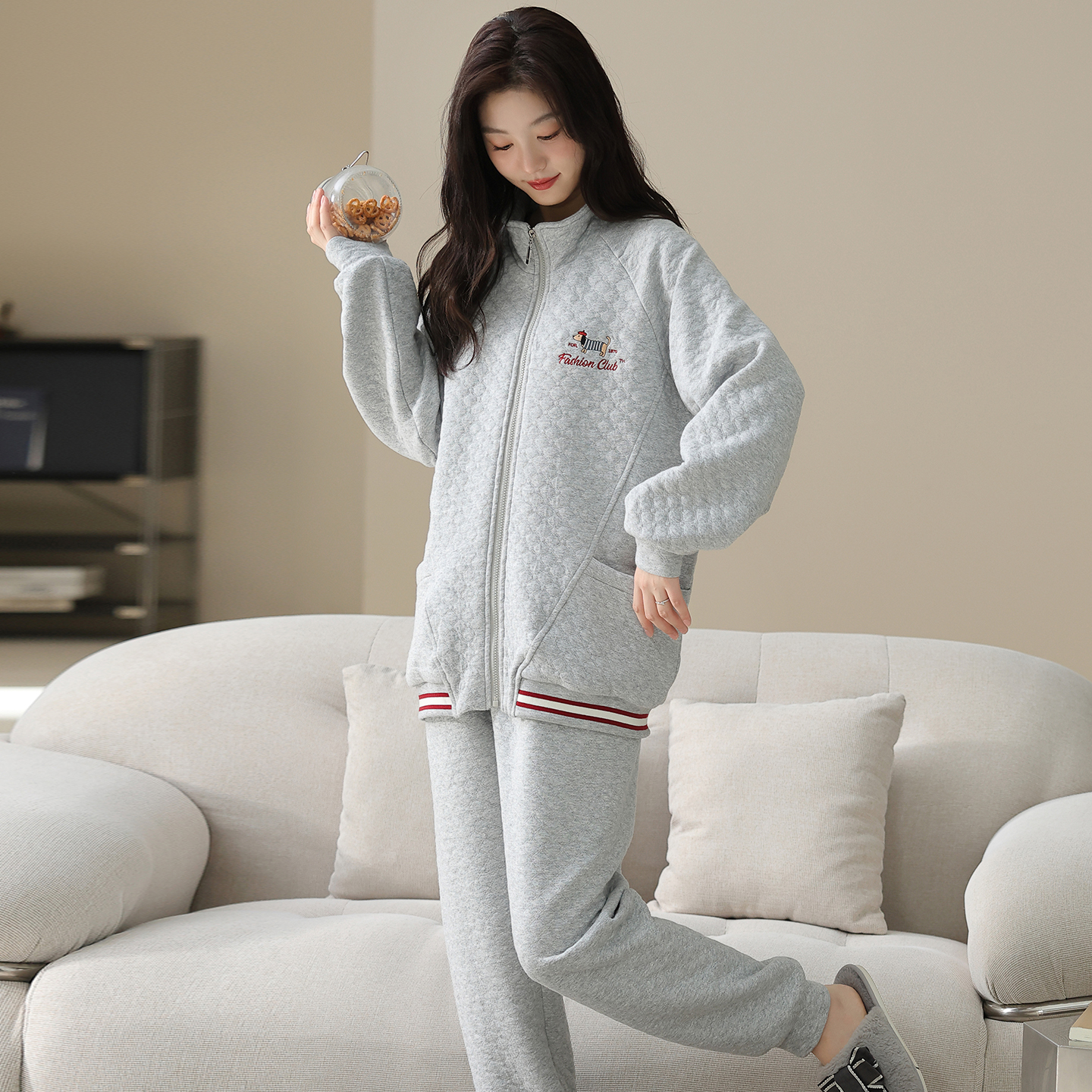 大码 春秋开衫 女士家居服 加厚珊瑚绒睡衣女冬法兰绒加绒套装 秋冬季