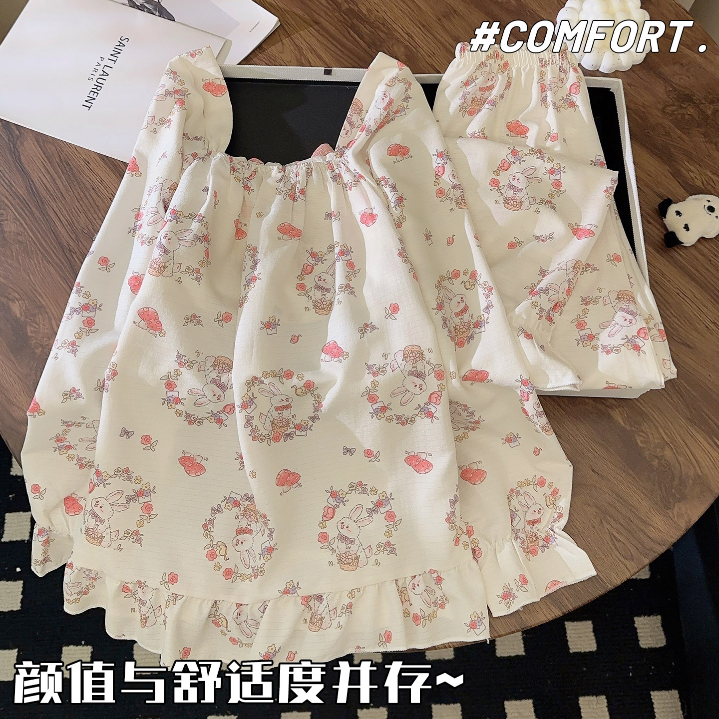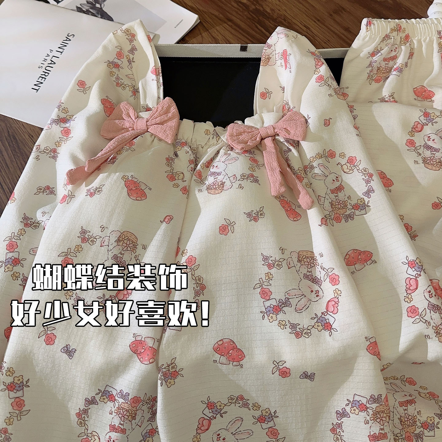 新款 春秋季 带胸垫少女家居服冬天 套装 公主风睡衣女甜美花环兔长袖