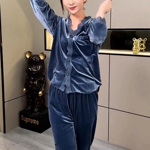 休闲气质长袖 2025秋冬季 V领开衫 性感睡衣套装 家居服女 金丝绒时尚
