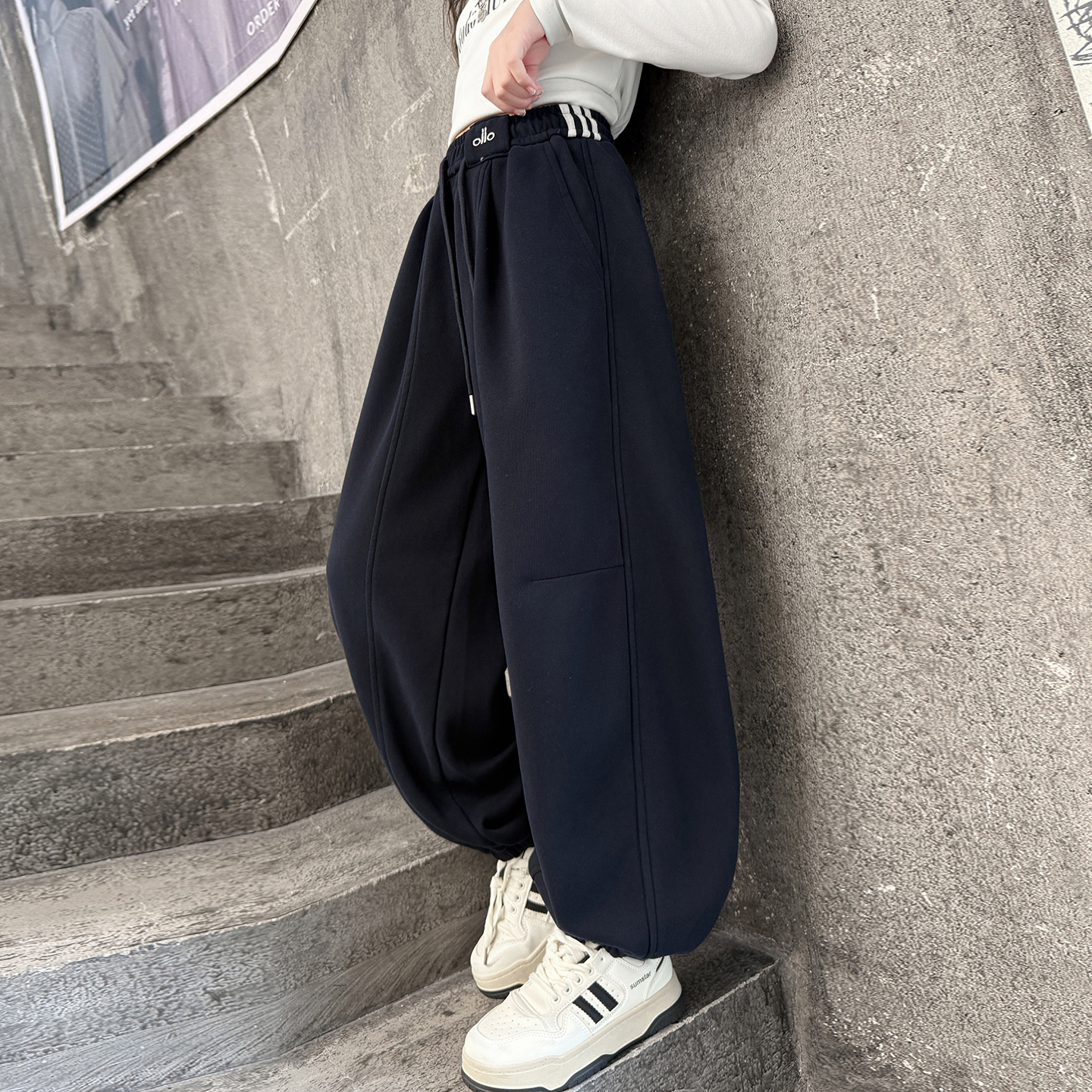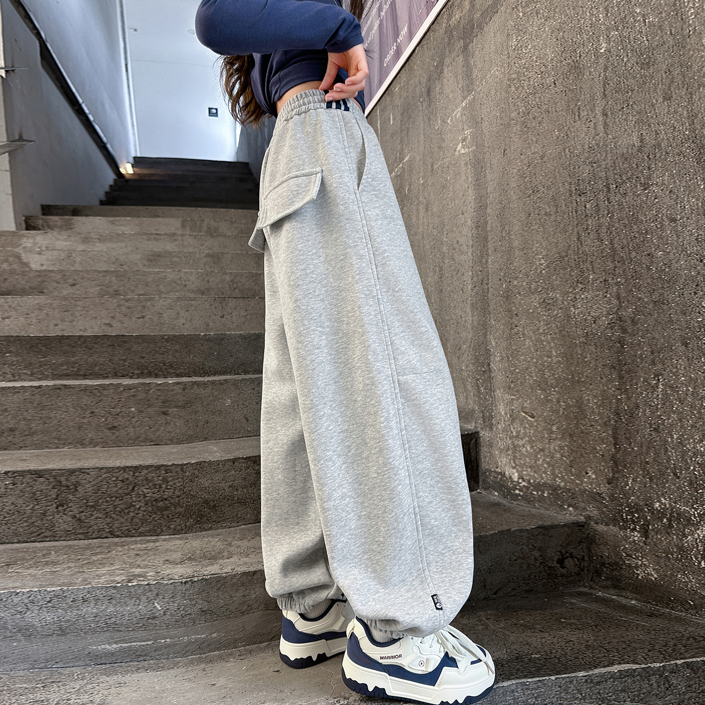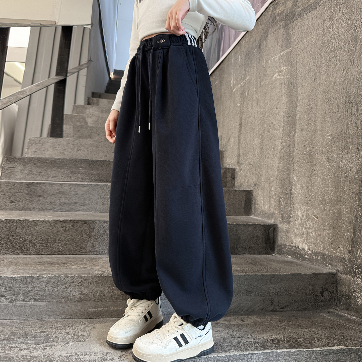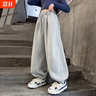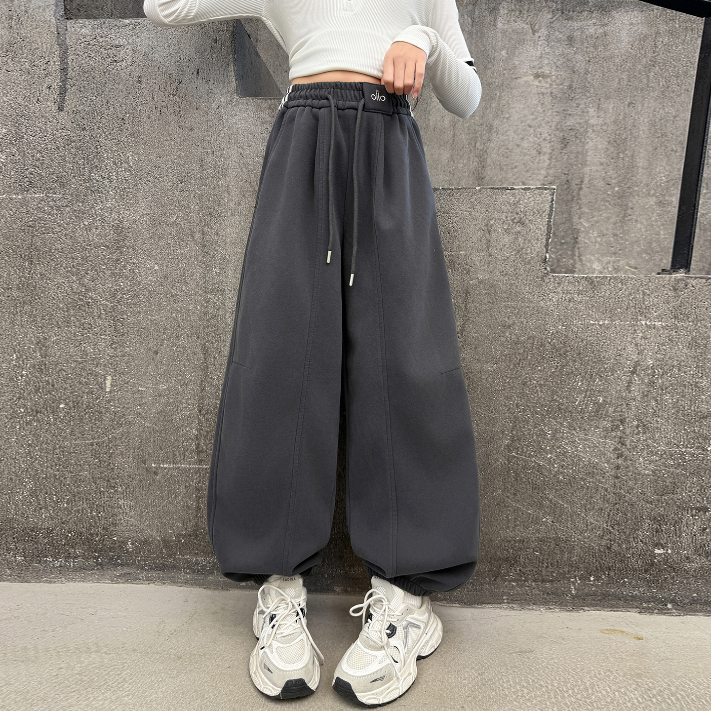 青少年儿童长裤 女童冬季 中大童宽松束脚裤 2025新款 潮加绒灰色 卫裤