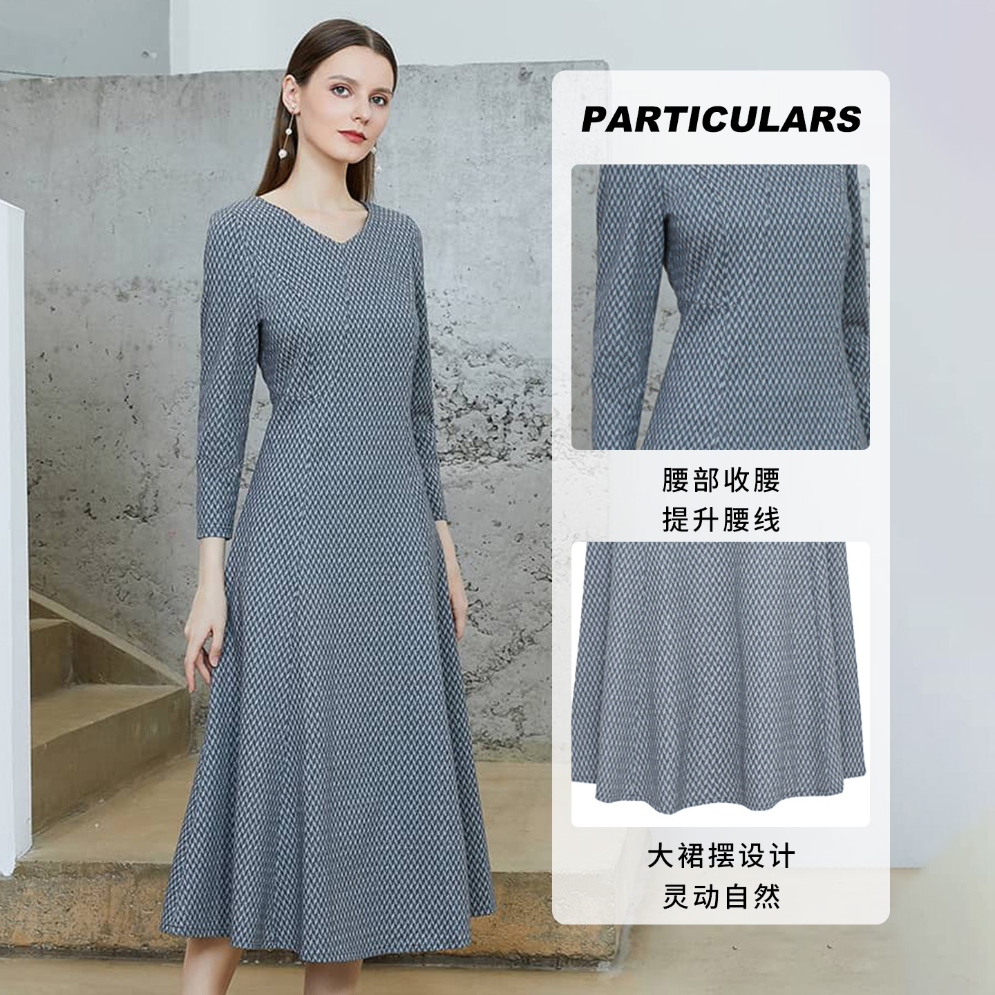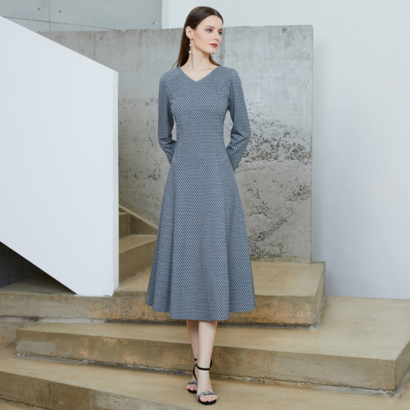 ELLASSAY歌力思秋冬新款 100%绵羊毛优雅气质提花V领连衣裙女