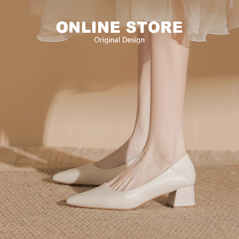 单鞋 通勤鞋 女2025新款 配旗袍工作皮鞋 浅口方头粗跟裸色鞋 真皮法式