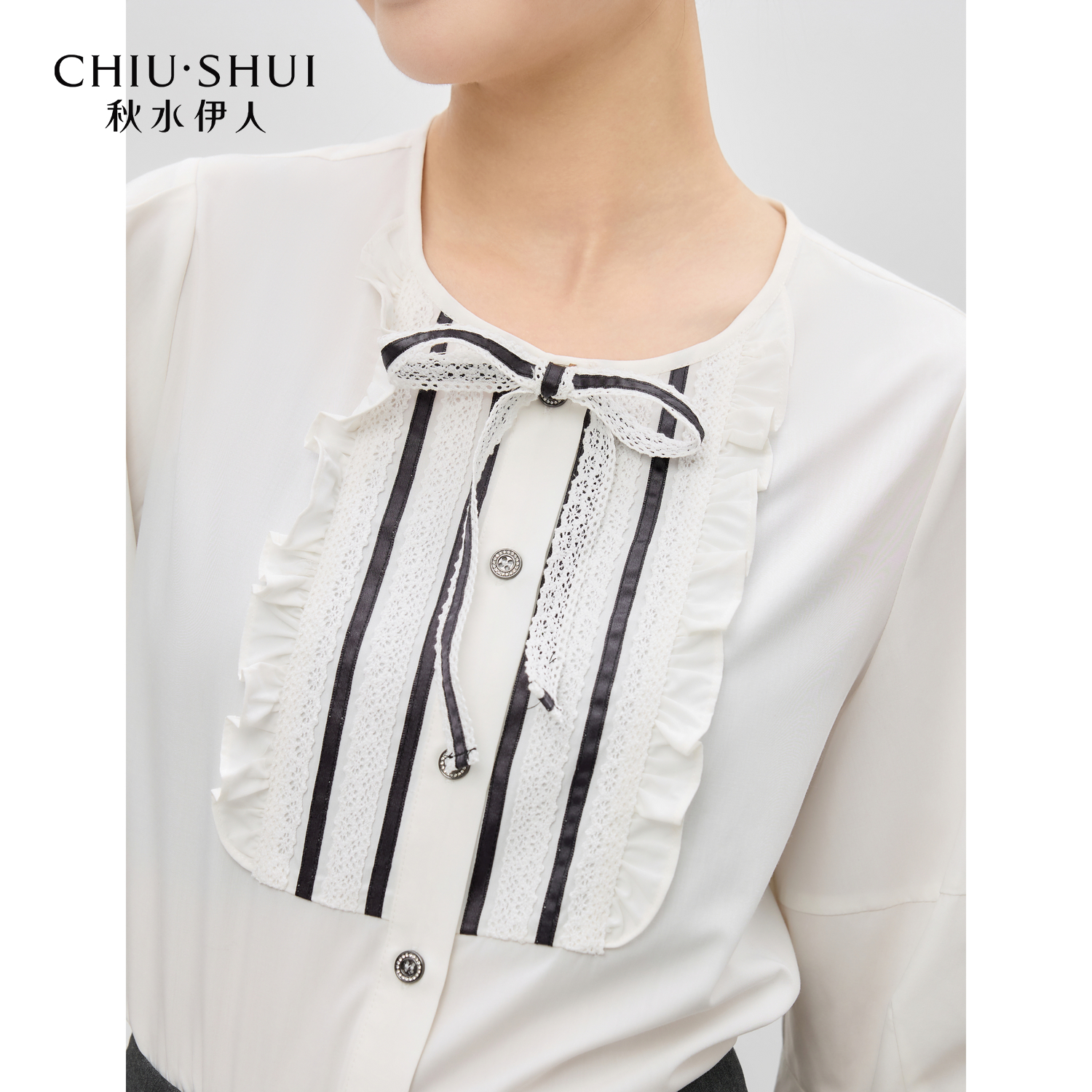 新款 2025年秋季 女h型百搭通勤花边上衣 衬衫 秋水伊人圆领系带短袖