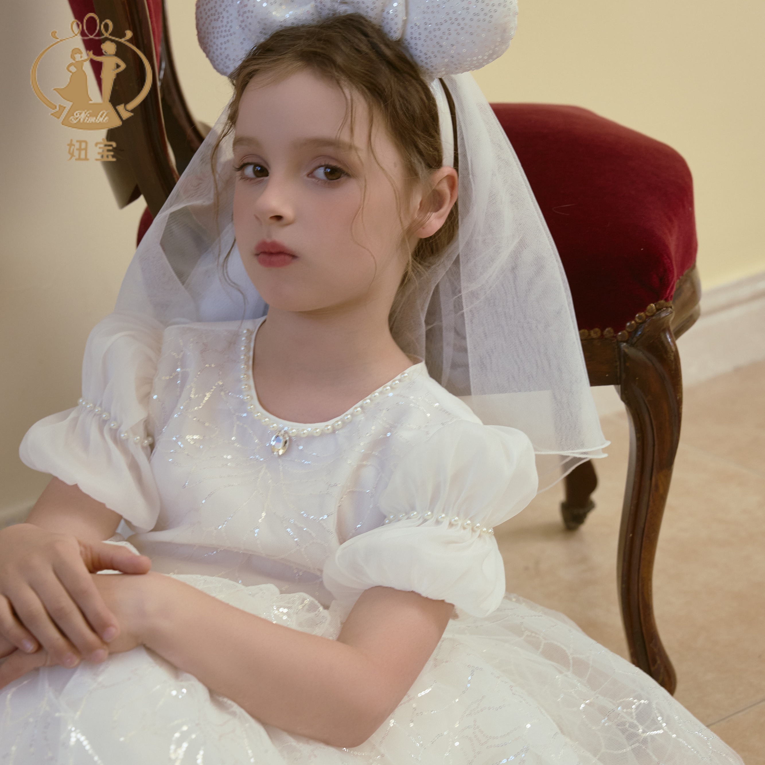 女童公主裙2025新款 小女孩礼服裙白色生日会宴蓬蓬裙主持演出服