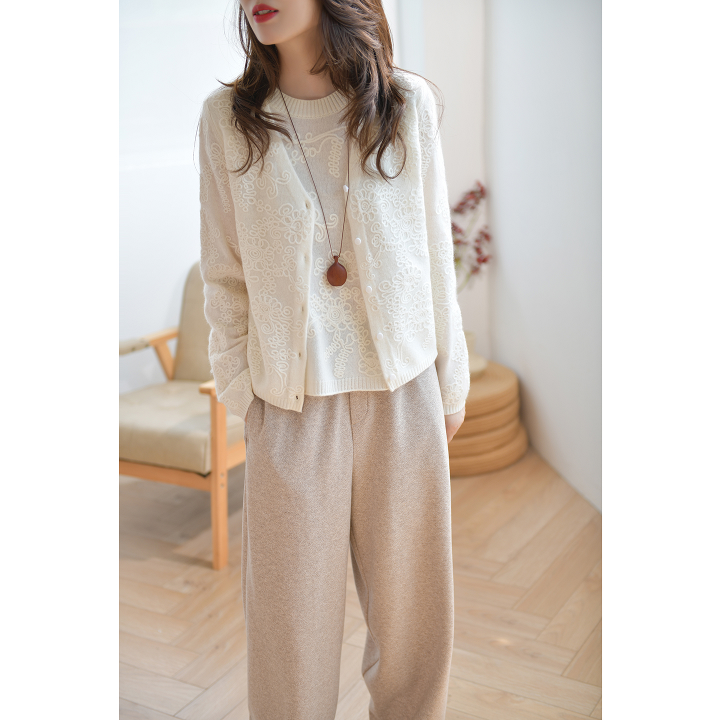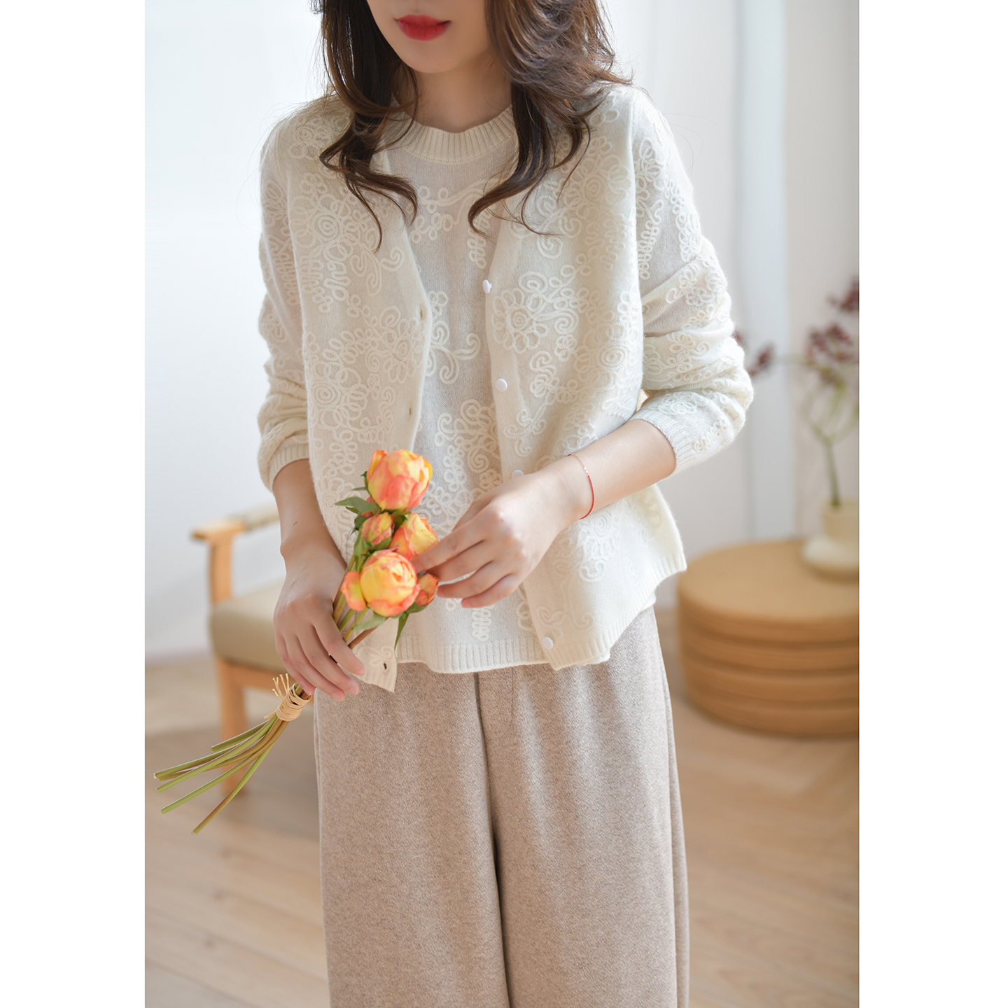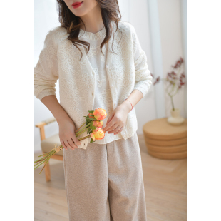 新款 女2025秋装 ELLE简约气质毛针织衫 圆领毛衣开衫 100%绵羊毛