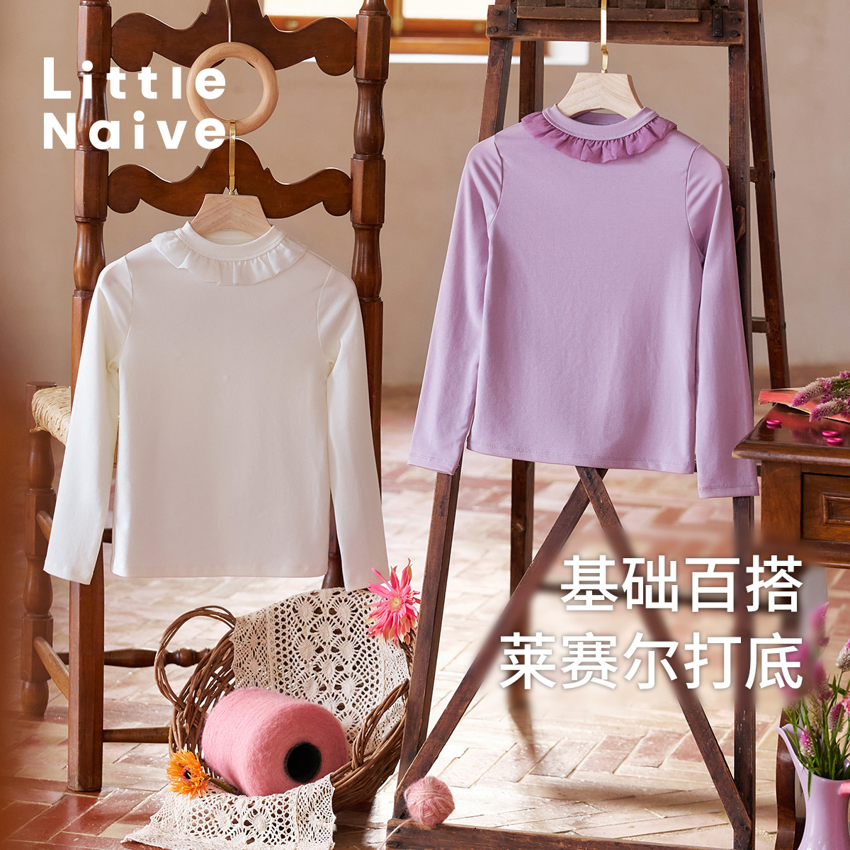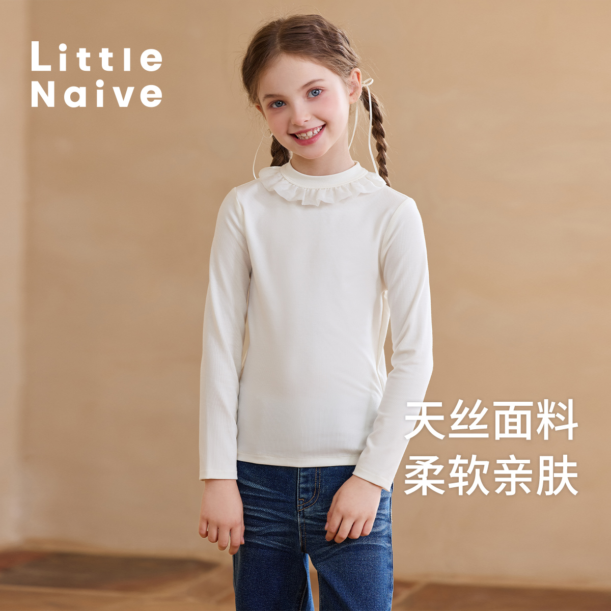 弹力上衣儿童花边长袖 春秋新款 t恤 Naive女童莱赛尔打底衫 Little